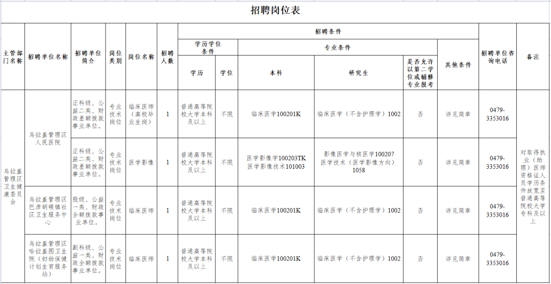 本次乌拉盖管理区公开招聘事业编制医疗卫生专业技术人员 4名,其中:专项招聘“高校毕业生” 1名。招聘岗位详见附件1。
