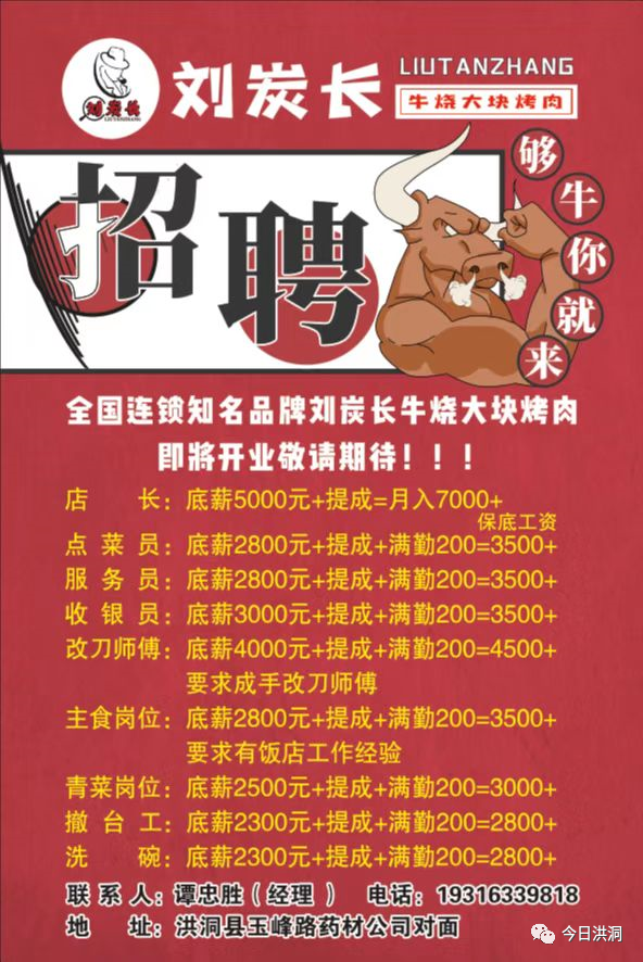 【招聘】 重八席大酒店因业务发展需要,现向社会诚聘以下人员: 人事主管,讲解员,房嫂,早餐员,餐厅服务员,餐厅传菜员,保洁,出品总监,厨师,厨房粗加工,打荷等若干名以上人员一经录用,待遇从优。报名电话: 18636745639 18734746157 报名地址: 重八席大酒店一层办公室