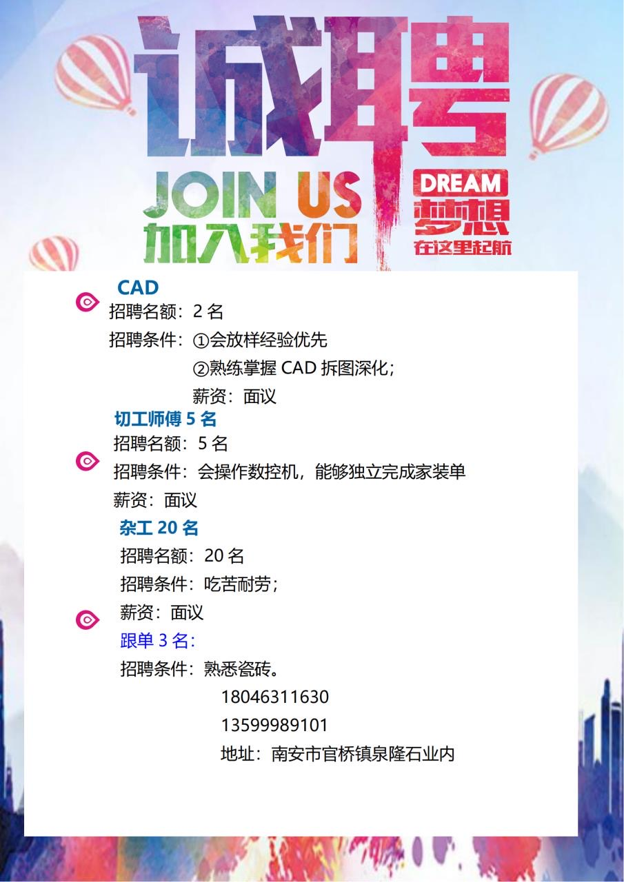 本厂主要生产全屋定制板式家具,业务需求,现招聘车间生产工人,负责开料,封边,打包。有无经验都可以。只要为人正直做事勤快就行。包吃住。