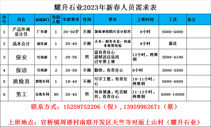 1、食品工厂里生产人员 : 男工数名40—50岁左右,工资面谈元,要求有敬业精神,能吃苦耐劳,手脚伶俐,且能严格执行公司的规章制度。