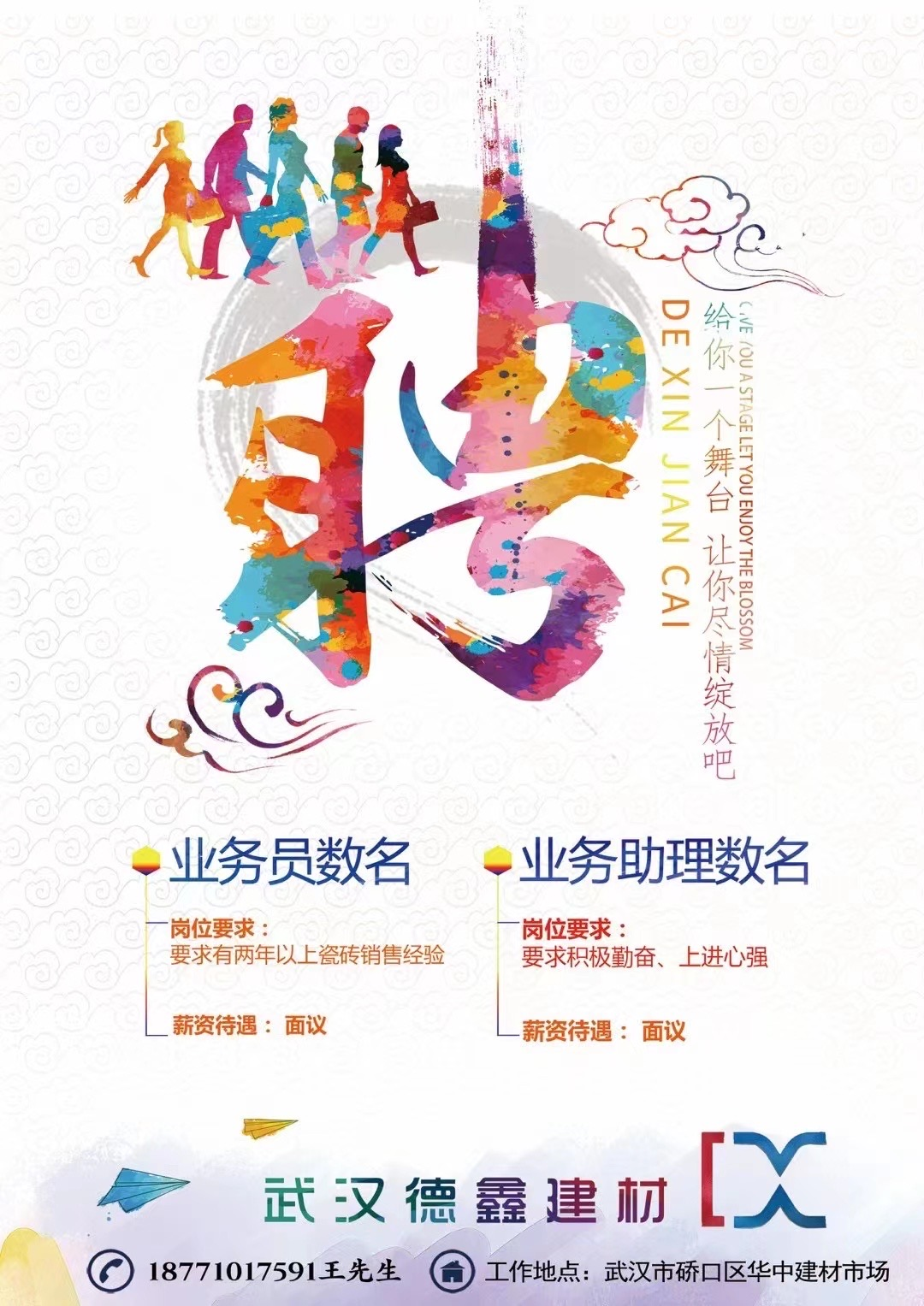 因业务发展需要,现诚聘:1,业务主手数名,要求有C1驾照,三年以上瓷砖分销销售经验。2,业务助理数名,要求有C1驾照,一年以上瓷砖分销销售经验。   ↵薪资:底薪+提成+年终奖,年薪保底7万起。
