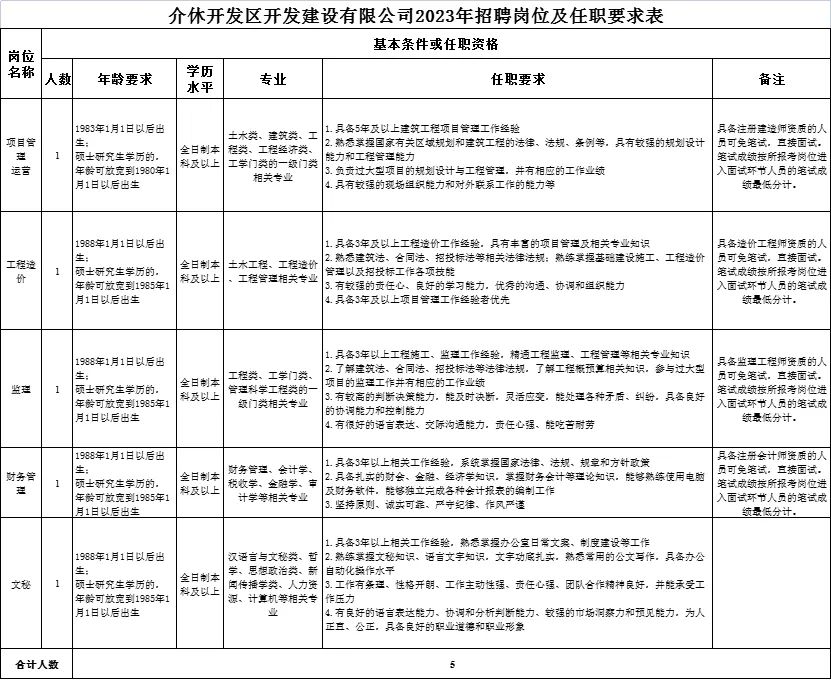 具体岗位条件及任职要求参见附件《介休开发区开发建设有限公司2023年招聘岗位及任职要求表》