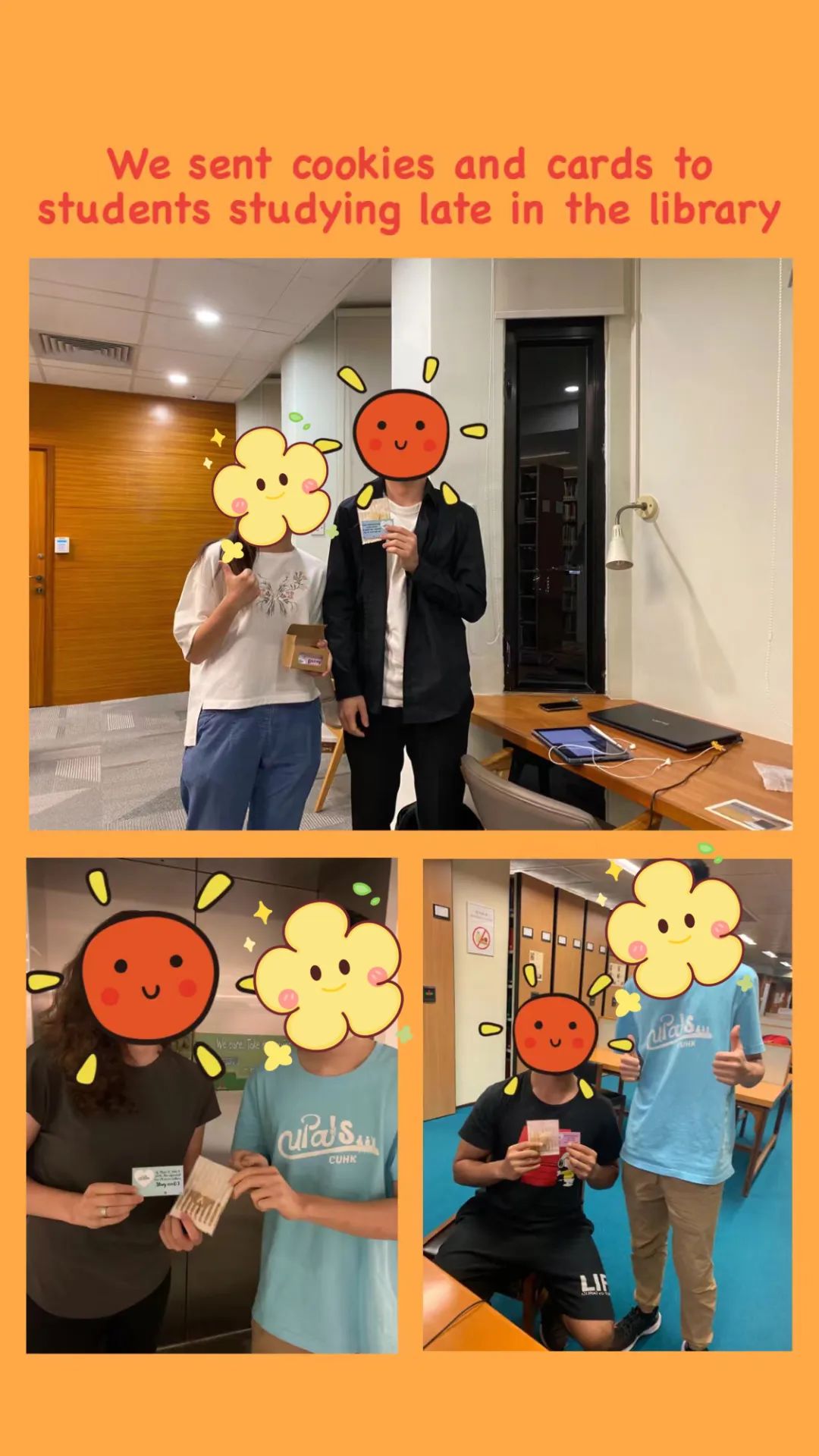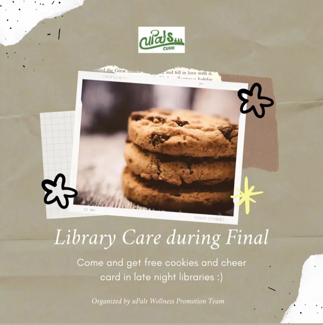 我们组讨论之后,决定在期中和期末期间,在学校图书馆快关门的时候派饼干以及写有鼓励的话的小纸条。