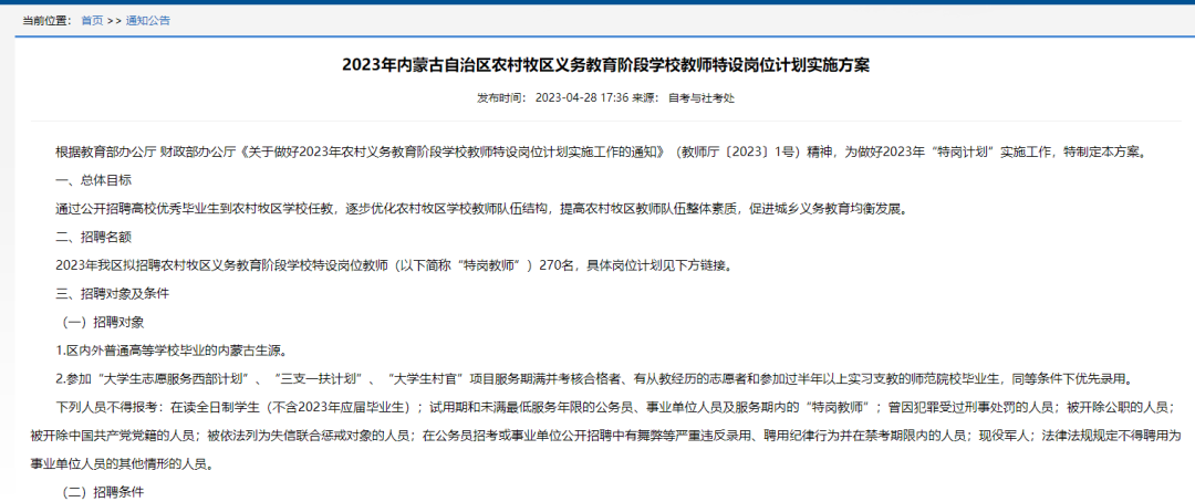 2023年我区拟招聘农村牧区义务教育阶段学校特设岗位教师(以下简称“特岗教师”)270名,具体岗位计划见下方链接。