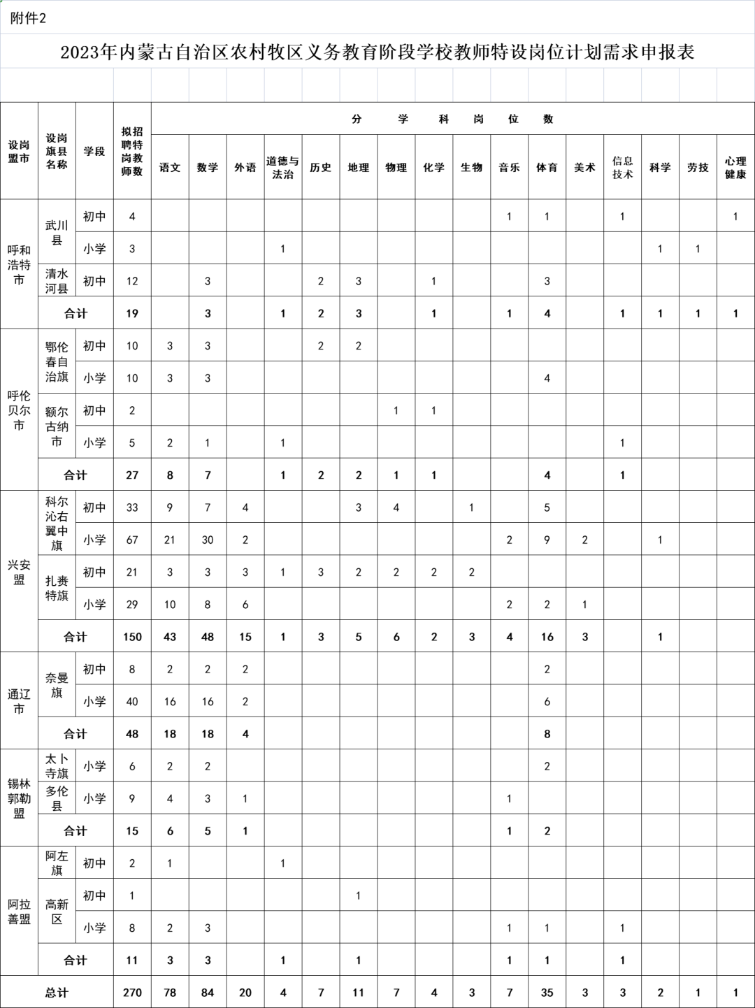 附件下载1:2023年内蒙古自治区农村牧区义务教育阶段学校教师特设岗位计划招聘计划.xls