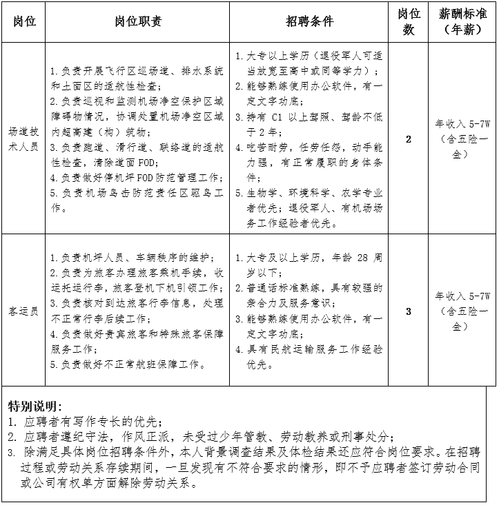 因工作需要,永州零陵机场现面向社会公开招聘场道技术员2名、客运员3名。