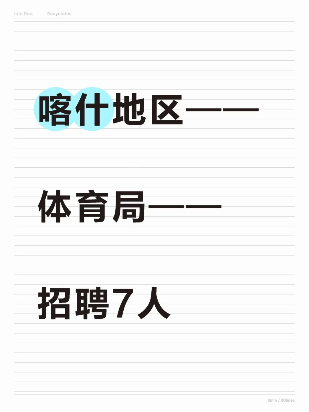 喀什地区,体育局,招聘7人 喀什地区——体育局——招聘7人!\n宝子们,喀什地区体育局青训中心的招聘公告来啦!这次一共招7个人,无笔试,报名时间截至9月30日,工作地点在喀什市,机会难得,快来看看有没有适合你的岗位呀!\n- 无笔试,直接面试,面试通过即可录用。\n- **招聘程序**:\n- **信息发布**:9月15日发布招聘公告。\n- **报名时间**:即日起至9月30日,抓紧时间哦。\n- **报名方式**:具体报名方式请查看公告,准备好相关材料。\n- **面试**:面试时间、地点另行通知,面试主要考查专业能力和综合素质。\n- **录用**:面试通过后,办理相关录用手续。\n- **工作地点**:喀什市,具体地址请查看公告。\n#喀什招聘 #体育局招聘 #青训中心 #无笔试 #好工作推荐 #就业机会 |