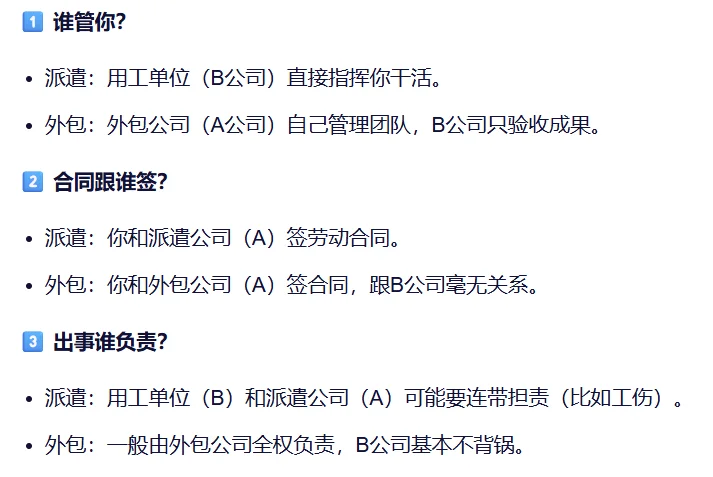 搞不清劳务外包和劳务派遣?一张图+3个重点 姐妹们!最近是不是又被“外包”“派遣”这些词整懵了? 别慌!今天手把手教你分清【劳动外包】和【劳务派遣】,职场小白也能秒变HR小达人✨ 🔍 先看定义(超简版): ✅ 劳务派遣: 你和A公司签合同,但被派去B公司干活,工资社保还是A公司发。 👉 你的人事关系在A,干活在B。典型“人在曹营心在汉”。 ✅ 劳动外包: B公司把某项业务(比如保洁、客服、IT运维)整体包给A公司做,A公司自己招人干活。 👉 B公司只看结果,不直接管你这个人。 📌 3个关键区别,记牢不踩坑: 1️⃣ 谁管你? 派遣:用工单位(B公司)直接指挥你干活。 外包:外包公司(A公司)自己管理团队,B公司只验收成果。 2️⃣ 合同跟谁签? 派遣:你和派遣公司(A)签劳动合同。 外包:你和外包公司(A)签合同,跟B公司毫无关系。 3️⃣ 出事谁负责? 派遣:用工单位(B)和派遣公司(A)可能要连带担责(比如工伤)。 外包:一般由外包公司全权负责,B公司基本不背锅。 💡 小贴士: 如果你在一家公司上班,但工资条、社保都不是这家公司发的——大概率是劳务派遣! 而如果你根本不知道“甲方”是谁,只听自己老板安排,那可能是外包。 🌟 总结一句话: 👉 派遣是“人”被派出去;外包是“活”被包出去。 搞清楚这个,签合同、维权、谈待遇都不怕被忽悠啦! 👇 你在工作中遇到过这两种情况吗?评论区聊聊~ 记得点赞+收藏 #职场干货 #劳务派遣 #劳动外包 #打工人必看 #合同避坑指南 #小红书职场笔记 |