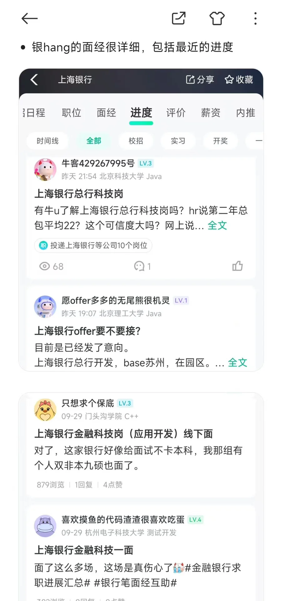 最近两天投了7个 中国东方:只能投1个岗位,子公司若干,需另外投递 中国国新:只能投1个岗位 中国太平:可以投5个,北京只有1个岗位,秒测评 华侨城集团:可投3个岗位 亦庄控股:可投2个岗位 保利集团:各公司要求不同,分开投递,秒测评 阳光保险:可投2个岗位,秒测评 这几天投的好多秒测评,都是北森,最符合和最不符合快把主包做成人格分裂了 国庆的最后一天终于快把落下的补完了,希望开工后不要新增很多 二编: 我投的央国企比较多,节后正式开工,其他银hang和私企大厂是牛克投递的,上面银hang的面经也比较多,可以根据别人分享的面经题和pl区的建议,有针对性的准备笔面试,同时还可以搜索企业福利待遇和薪资情况,更真实的了解目标企业,为offer选择提供参考~ #秋招 #offer #国企秋招 #校招 #面试 #笔试 #继续找工作 #银行#牛客 #牛客网 |
