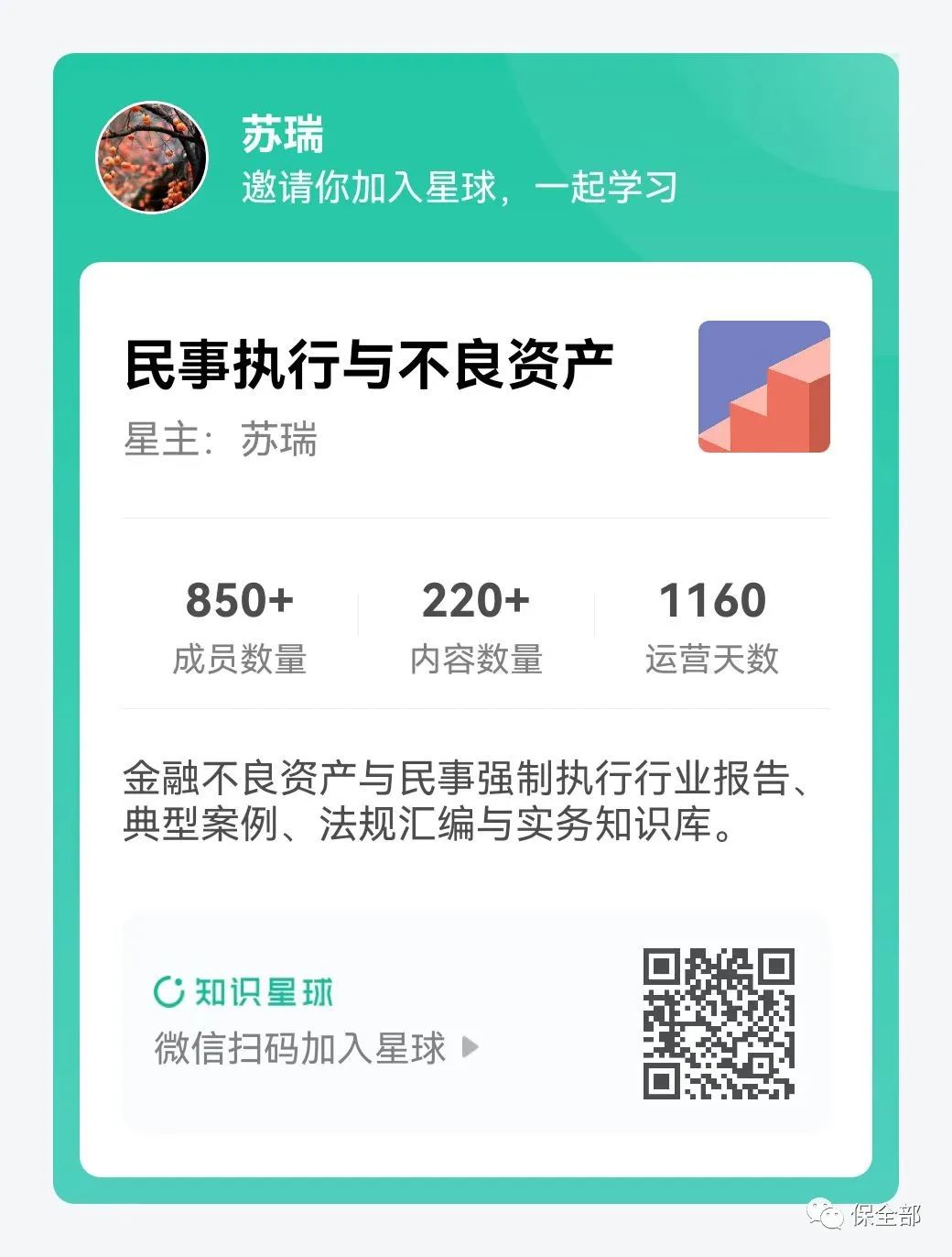 知识星球已汇编整理、收集发布强制执行与不良资产处置相关法规、案例与实务等资料合辑200余部,扫描下图二维码即可加入下载,与850+星友共同学习。