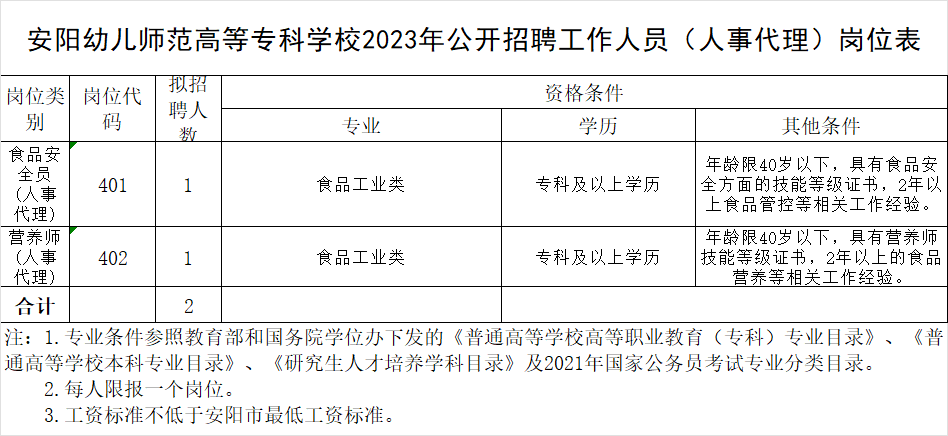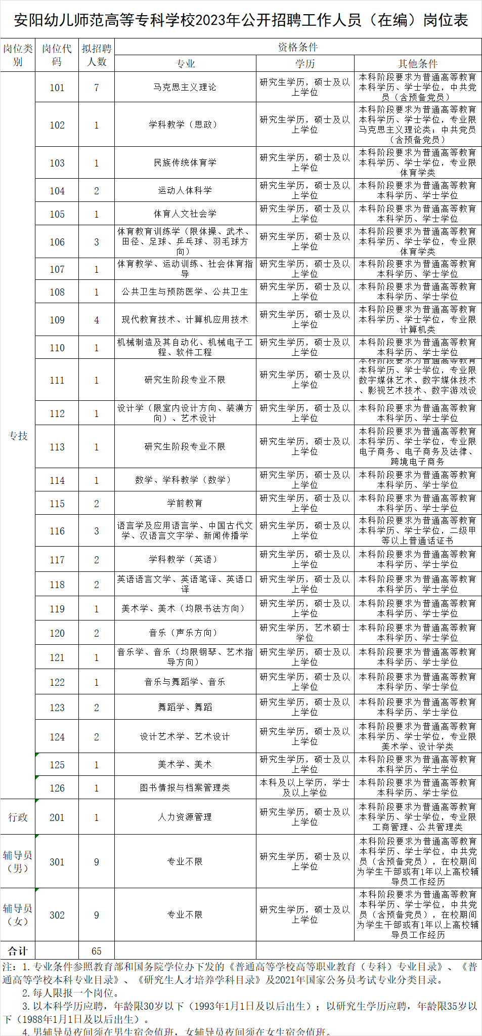 具体数量、范围、对象、条件见《安阳幼儿师范高等专科学校2023年公开招聘工作人员(在编)岗位表》(附件1)和《安阳幼儿师范高等专科学校2023年公开招聘工作人员(人事代理)岗位表》(附件2)。