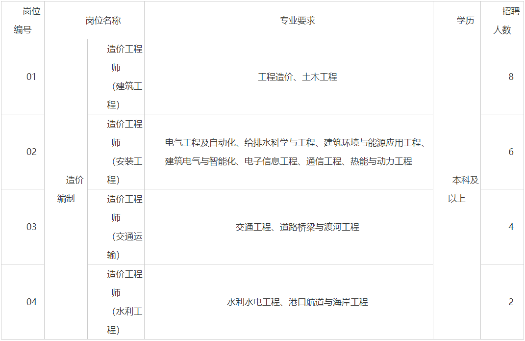 2.具有本科及以上学历(专业要求,详见上表),具有对应岗位专业二级及以上造价工程师职业资格。年龄:1988年5月1日及以后出生。