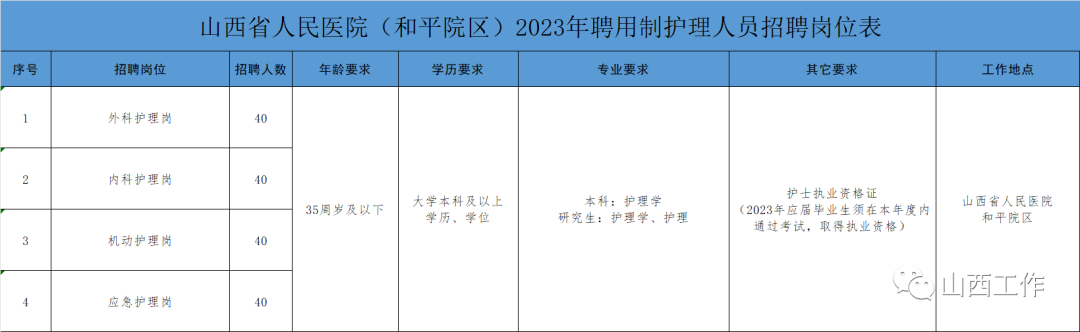 山西省人民医院(和平院区)2023年招聘聘用制护理人员160名,招聘岗位及所需的具体条件以《山西省人民医院(和平院区)2023年聘用制护理人员招聘岗位表》(附件1,以下简称《岗位表》)中的要求为准。