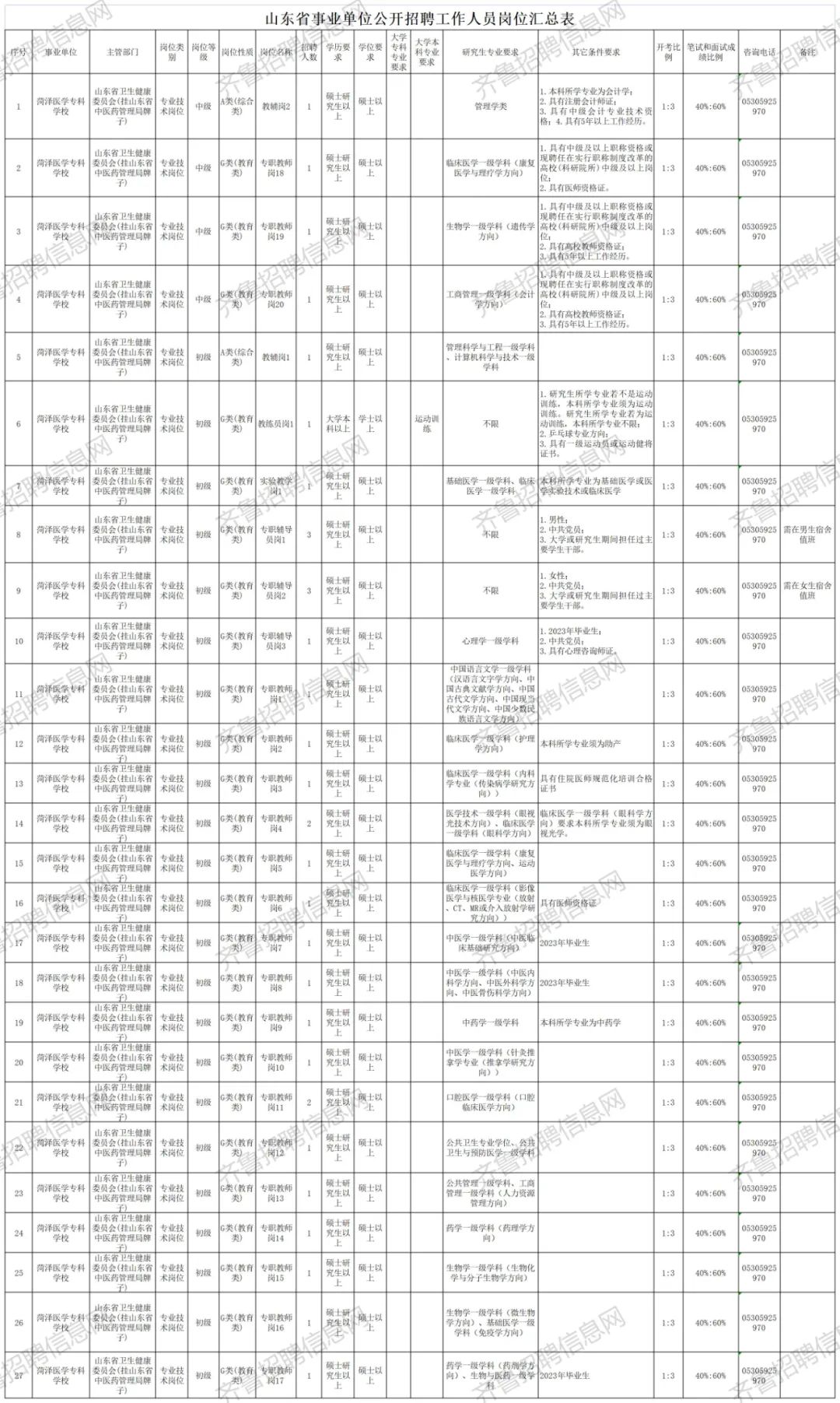 根据中共山东省委组织部、山东省人力资源和社会保障厅关于印发《2023年度省属事业单位公开招聘工作实施方案的通知》(鲁人社发〔2022〕23号)要求,结合工作需要,菏泽医学专科学校2023年拟面向社会公开招聘工作人员33名,专业技术初级岗29人,专业技术中级岗4人。具体岗位及条件详见《省属事业单位公开招聘工作人员岗位汇总表》(附件1)。