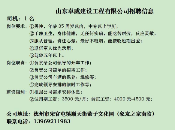 招聘C本司机,开4.2厢车。跑德州周边二百公里到500公里左右。当天回不来正常两天一圈。要求能吃苦耐劳。有责任心的人。非诚勿扰。工资按月发放。