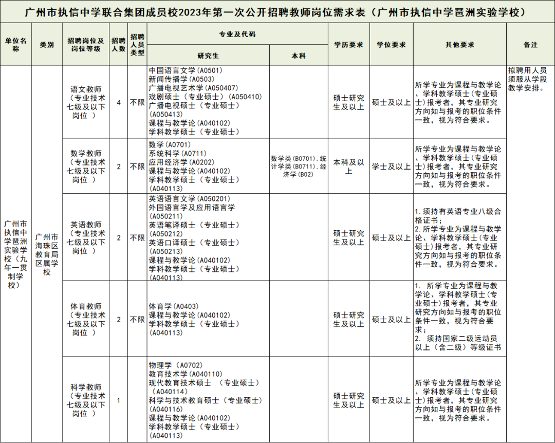 招聘岗位详见《广州市执信中学联合集团成员校2023年第一次公开招聘教师岗位需求表》(广州市执信中学琶洲实验学校)。以上获聘人员均为事业单位编制人员。
