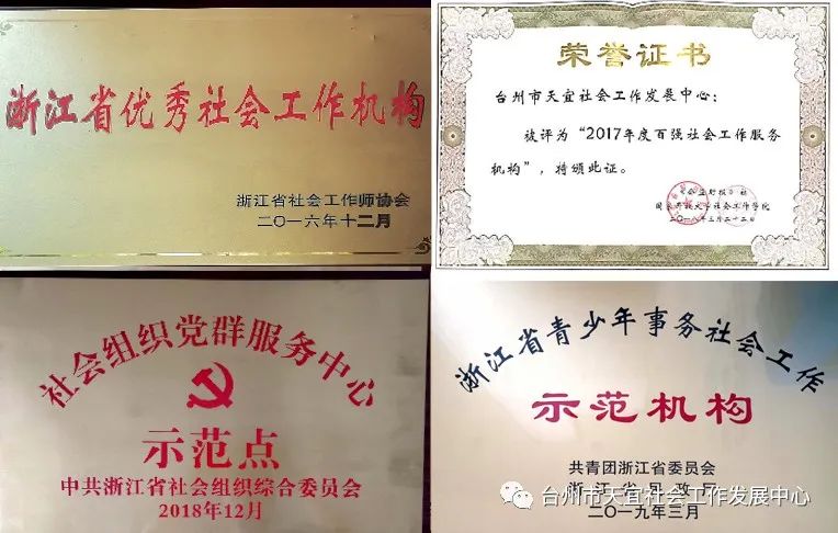 作为浙江省首批本土社工机构之一,天宜先后获得过 “全国百强社会工作服务机构”、“第三届中国青年公益服务大赛银奖”、“浙江省品牌社会组织”、“浙江省优秀社会工作机构”和“浙江省青少年事务社工示范机构”等荣誉。曾两度接受央视专题报道。