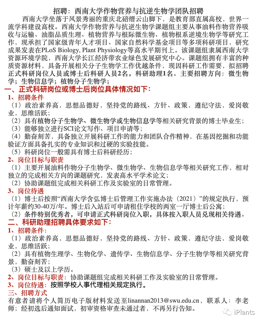 iPlants专注于全球植物科学前沿研究报道,已有二十万多学者关注。现已组建了30个500人/群的植物科学研究的研究生/教授的实名认证交流群,其都来自全球各大高校和研究所的同学和老师。欢迎从事植物科学相关研究的同学和老师加入我们,一起讨论学术和梦想。温馨提示:加iPlants助手微信号(ID: iplants-1)或长按下面二维码时进群时,请备注一下学校+专业+学生/老师,以便我们能拉你进相应的交流群,否则不予通过)投稿、商务合作、转载开白名单等事宜请联系微信ID:iplants或18321328797 或邮箱:703131029@qq.com