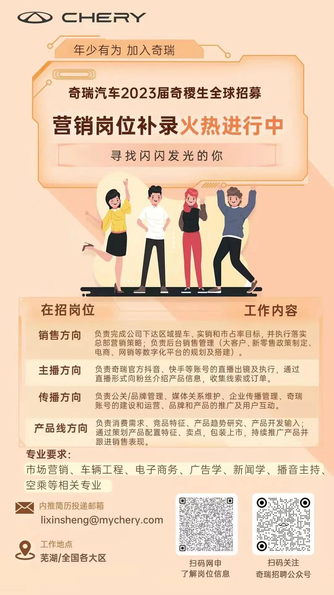 【校园招聘】年少有为 加入奇瑞 | 奇瑞汽车2023届奇稷生全球招募营销岗位补录火热进行中