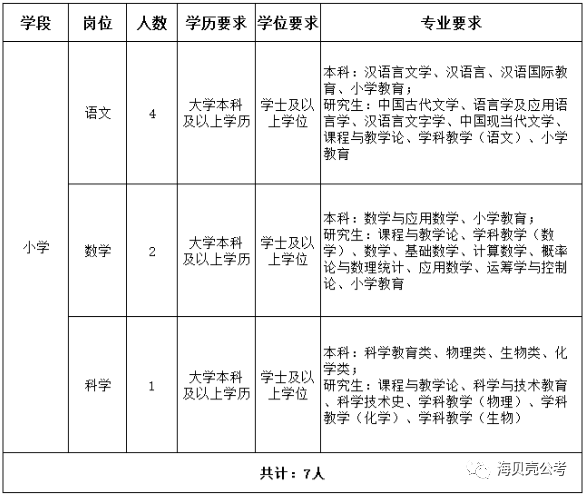 学校因发展需要,现面向社会公开招聘小学教师7名,具体要求如下。