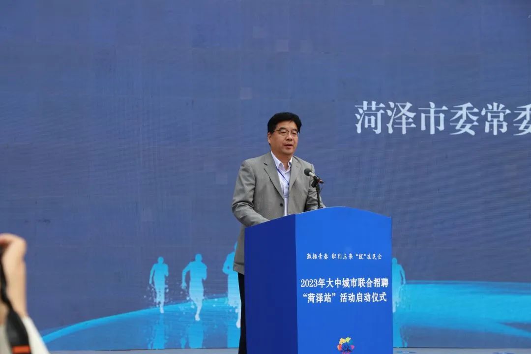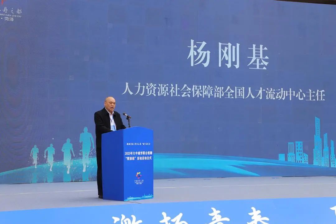 杨刚基在讲话中强调,高校毕业生是宝贵的人才资源,党中央国务院高度重视高校毕业生就业工作,本次“菏泽站”活动广泛动员各级公共就业人才服务机构、高校、用人单位和人力资源服务市场机构参与,掀起了求职招聘热潮,是人社部门落实学习贯彻习近平新时代中国特色社会主义思想主题教育精神,助力民营企业与高校毕业生信息互通、双向奔赴的重要抓手和载体。希望山东省及菏泽市以此次活动为契机,用心用情用力组织好本次活动,助力大中城市巡回招聘活动发展成为信誉好、成功率高、服务有保障的品牌活动,切实促进高校毕业生高质量就业和民营经济高质量发展。