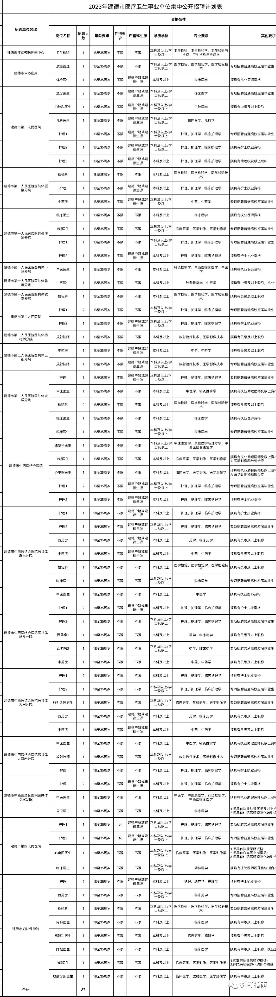 [浙江] 杭州市建德市医疗卫生事业单位,2023年度招聘护士、临床医师、中医、口腔医师、影像、检验、康复、药师、公卫医师等87人