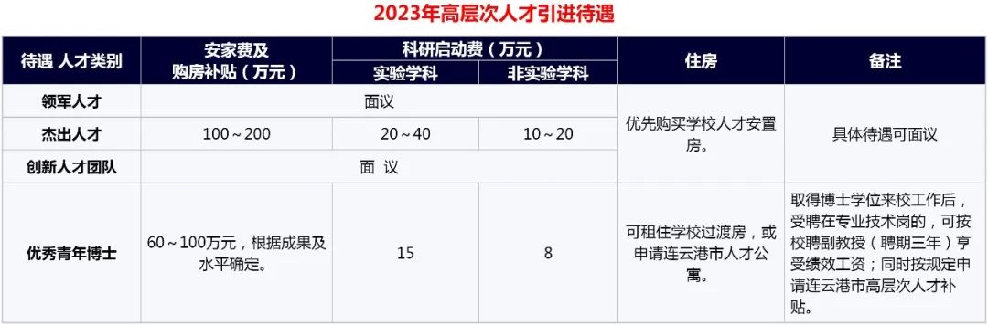 (3)引进博士可享受学校1000元/月租房补贴,发放三年;入住连云港市人才公寓期间减半发放。
