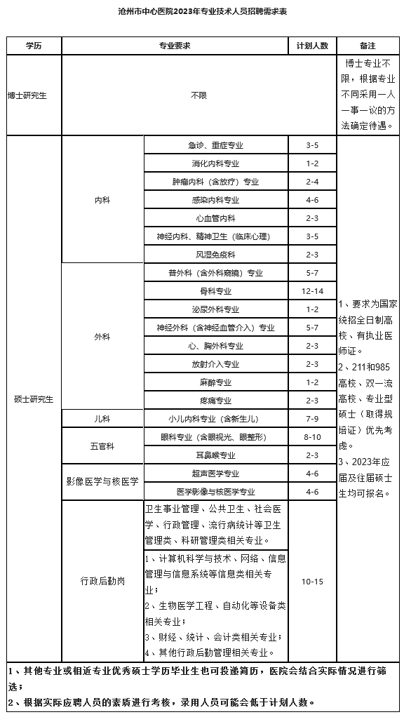 具体岗位需求详见《沧州市中心医院2023年专业技术人员招聘补录需求表》