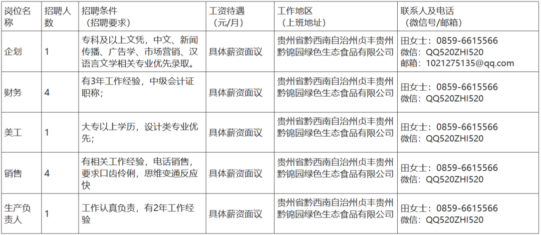 贵州黔锦园绿色生态食品有限公司招聘