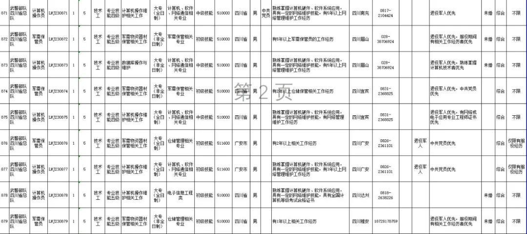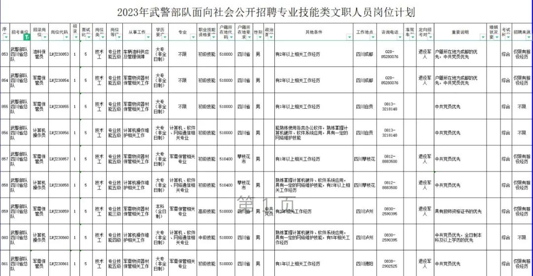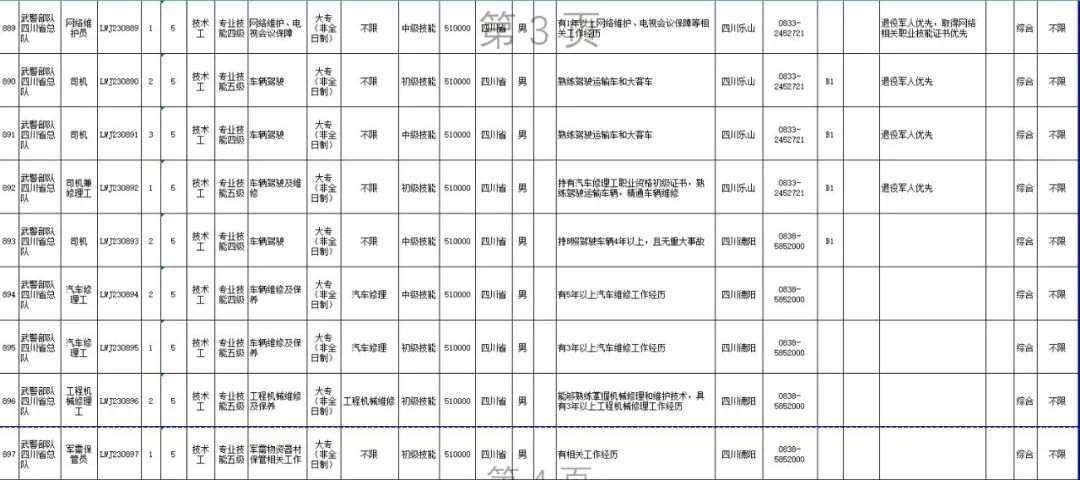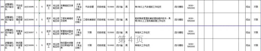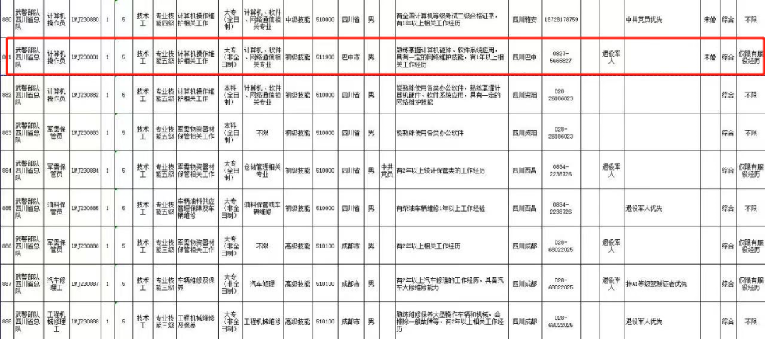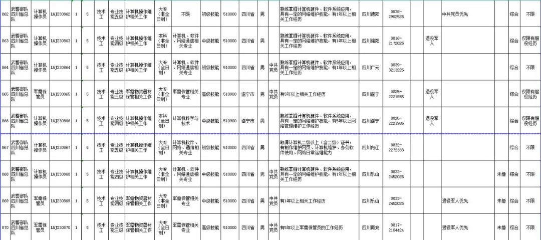 武警部队所属用人单位运输投送、装备维修、物资器材储存、军犬繁育、信息通信等专业技能三级以下文职人员岗位。