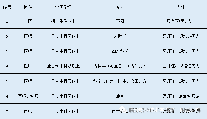 临汾职业技术学院第一附属医院(临汾市职业病防治院、原临汾市第二人民医院、原临汾市骨科医院)始建于1970年,是一所集医疗、教学、科研及预防保健为一体的综合性教学医院,医院现有南、北两个院区,共开放床位650张,设职能科室19个、临床科室35个、医技科室10个;其中检验科为山西省职业教育高水平重点学科,护理为山西省高水平护理实训基地,骨科被市卫健委确定为“临汾市提质强医工程十大临床重点专科”,心血管内科、创伤科、脊柱科、泌尿外科为临汾市重点学科;拥有职工800余人,其中正高职称43人,副高职称139人,中级职称214人。为了进一步优化医院人才队伍,充实医院综合力量,我院根据实际需求,面向社会公开招聘医疗人员若干名。