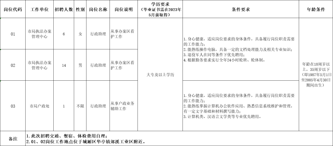 面向2023年3月公开招聘警务辅助人员笔试、体能测试合格但未被正式聘用的大专及以上学历考生。