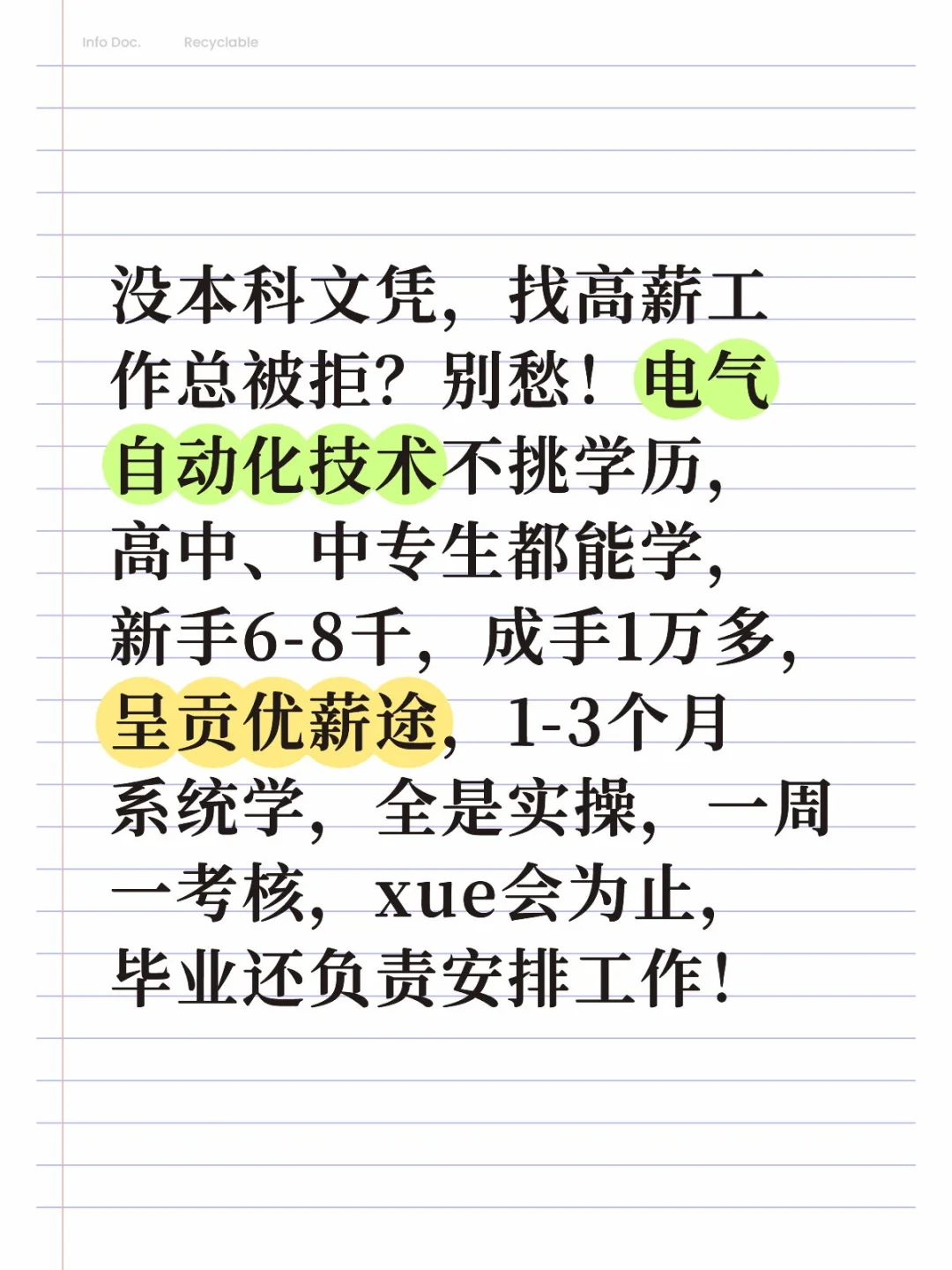 没本科文凭,找高薪工作总被拒?别愁!电气自动化技术不挑学历,高中、中专生都能学,新手6-8千,成手1万多,呈贡优薪途,1-3个月系统学,全是实操,一周一考核,xue会为止,毕业还负责安排工作!