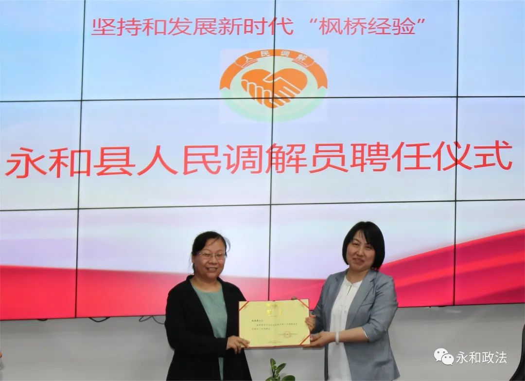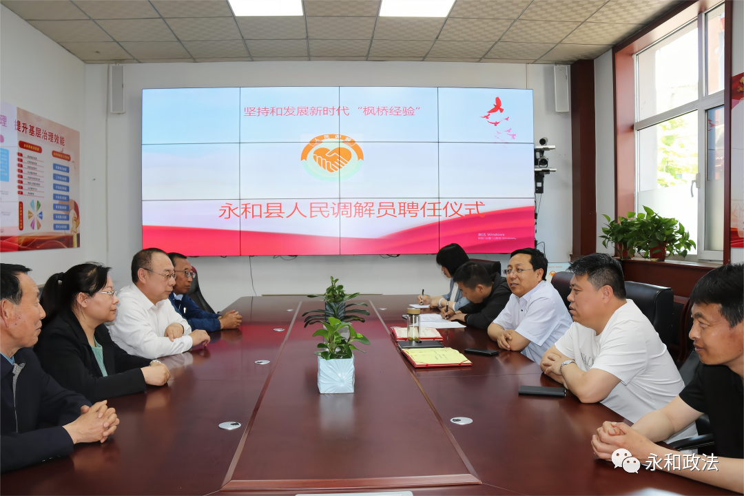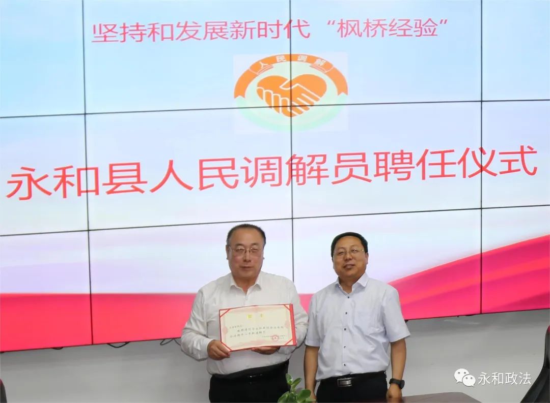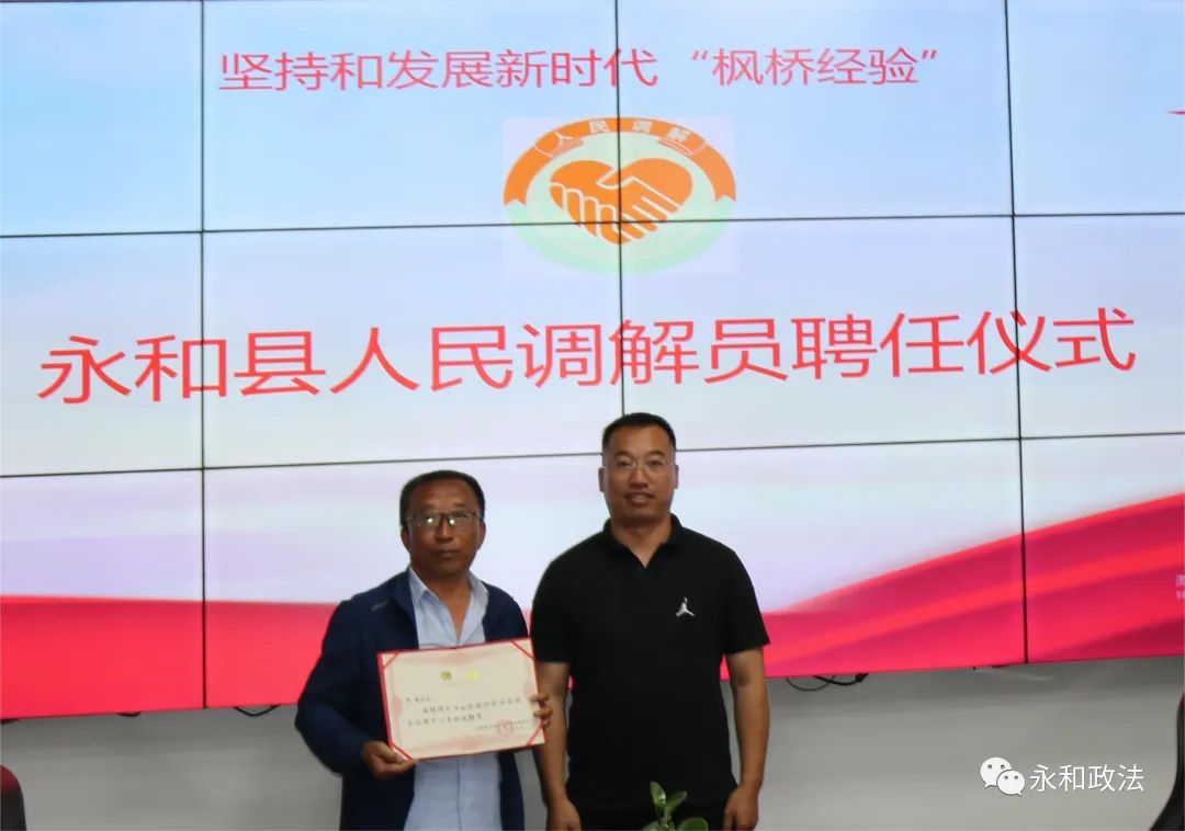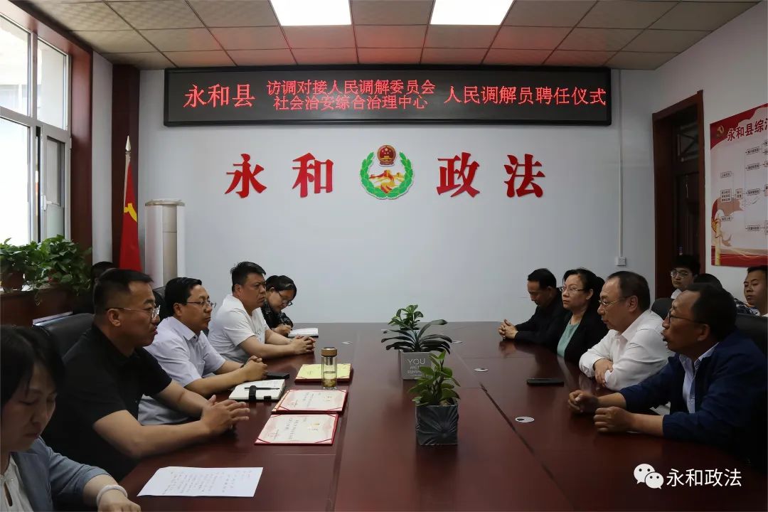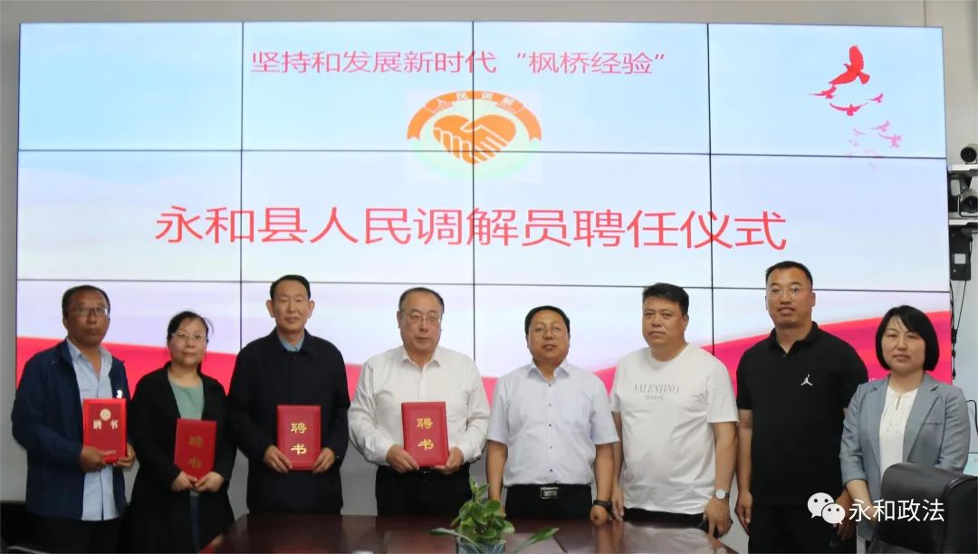 为进一步坚持和发展新时代“枫桥经验”,化解基层矛盾纠纷,助力转型发展,充分发挥人民调解在矛盾纠纷化解中的重要作用,5月16日,永和县访调对接人民调解委员会联合永和县社会治安综合治理中心举办了人民调解员聘任仪式。县委常委、政法委书记郭东舟,政府副县长、公安局长刘勇辉出席仪式并为受聘的人民调解员发放聘书。
