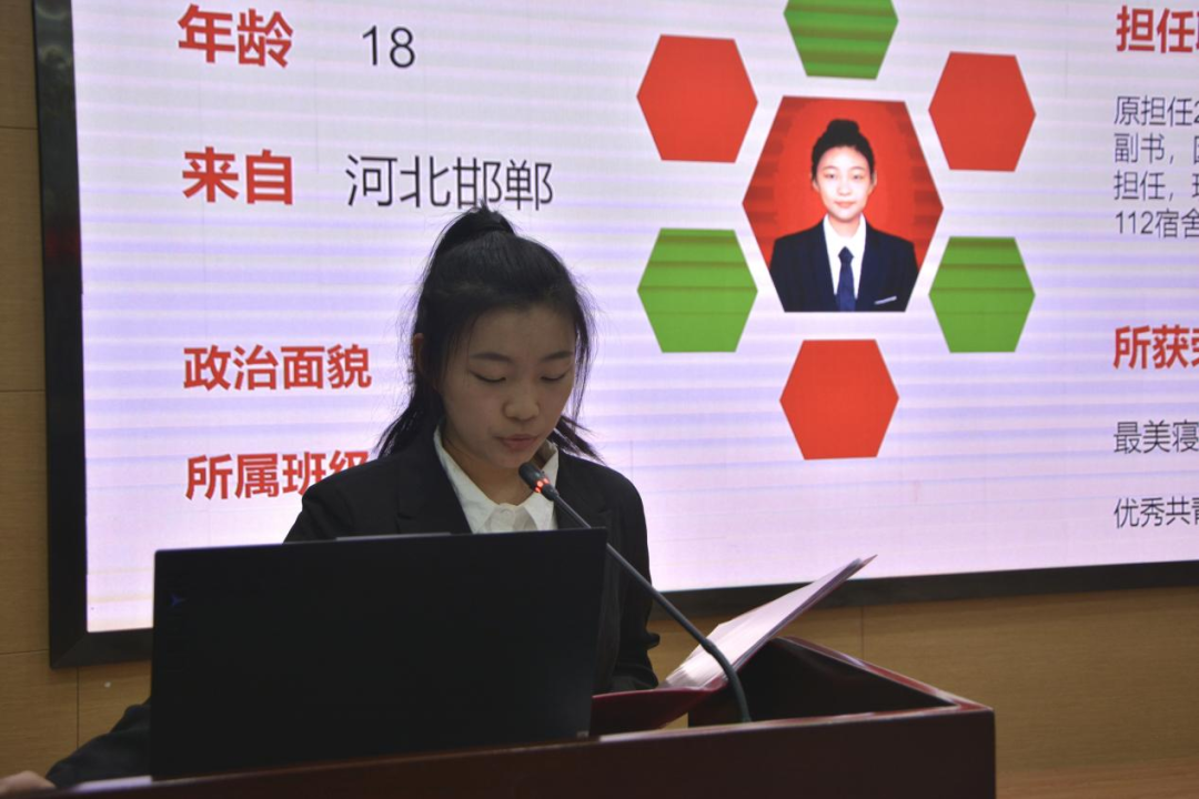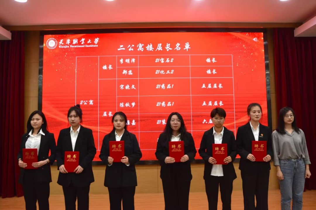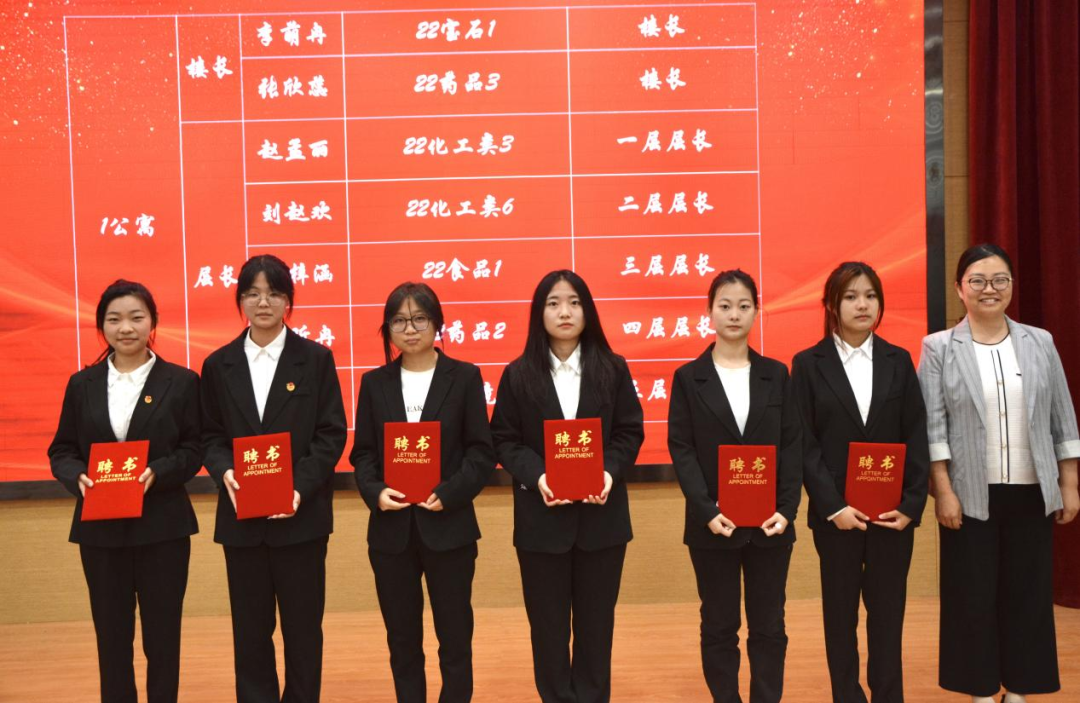 接着,季扬老师宣读楼层长聘任名单,王雪老师与辅导员老师们为他们颁发了聘书。楼层长代表郑蕊进行了表态发言,她表示,今后要认真做好楼层长的工作,协助老师把学院宿舍管理好,关注同学们的思想动态,对于楼内的突发情况、安全隐患等及时发现、及时报告,确保每一位同学的生命与财产安全。