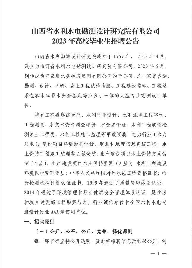 原文标题:山西省水利水电勘测设计研究院有限公司2023年高校毕业生招聘公告