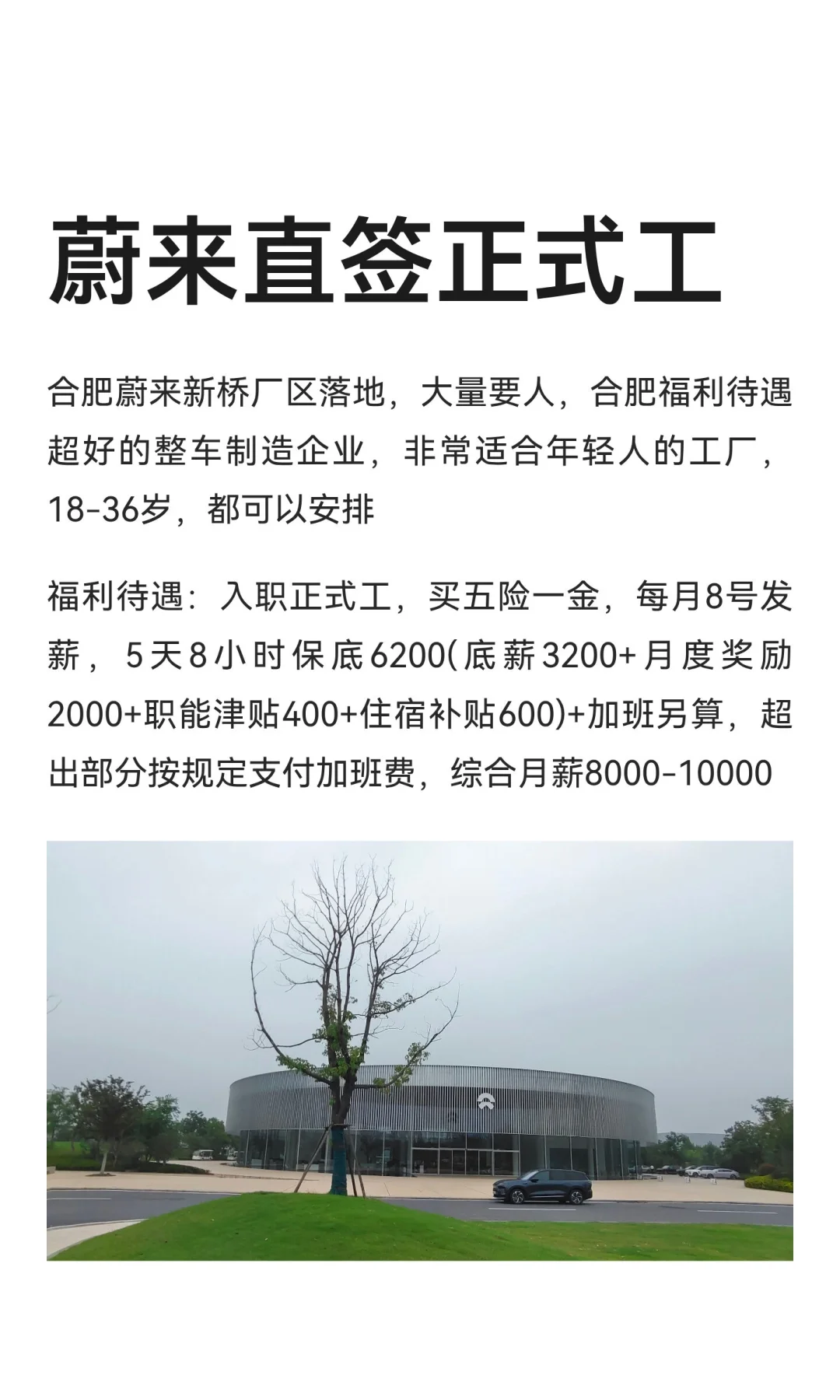 合肥蔚来新桥厂区落地,大量要人,合肥福利待遇超好的整车制造企业,非常适合年轻人的工厂,18-36岁,都可以安排
