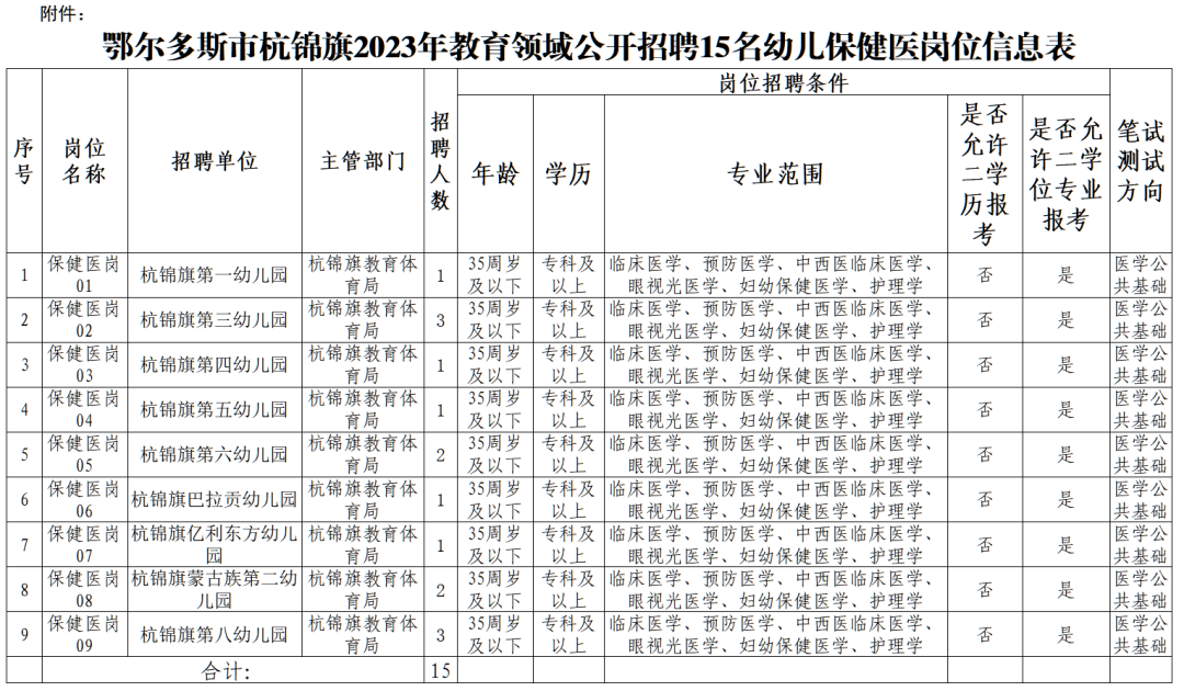 附件:鄂尔多斯市杭锦旗2023年教育领域公开招聘15名幼儿保健医岗位信息表