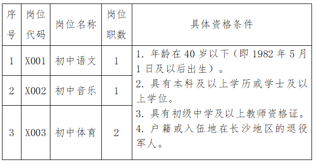 根据《事业单位人事管理条例》(国务院令652号)、《事业单位公开招聘违纪违规行为处理规定》(人社部令第35号)、《湖南省事业单位公开招聘人员办法》(湘人社发〔2019〕1号)、《中共长沙市委 长沙市人民政府关于全面深化教师队伍建设的实施意见》(长发〔2019〕10号)和《长沙市促进新时代退役军人就业创业工作实施办法》(长退役军人发〔2022〕35号)精神,现将长沙市新城学校面向长沙地区退役军人定向招聘有关事项公布如下: