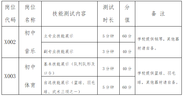 3.X001初中语文岗位考核由面试、试教组成,X002初中音乐、X003初中体育岗位考核由面试、试教、技能测试组成,面试、试教、技能测试满分均为100分。面试、试教时长共10分钟,准备时长30分钟。技能测试办法见下表:
