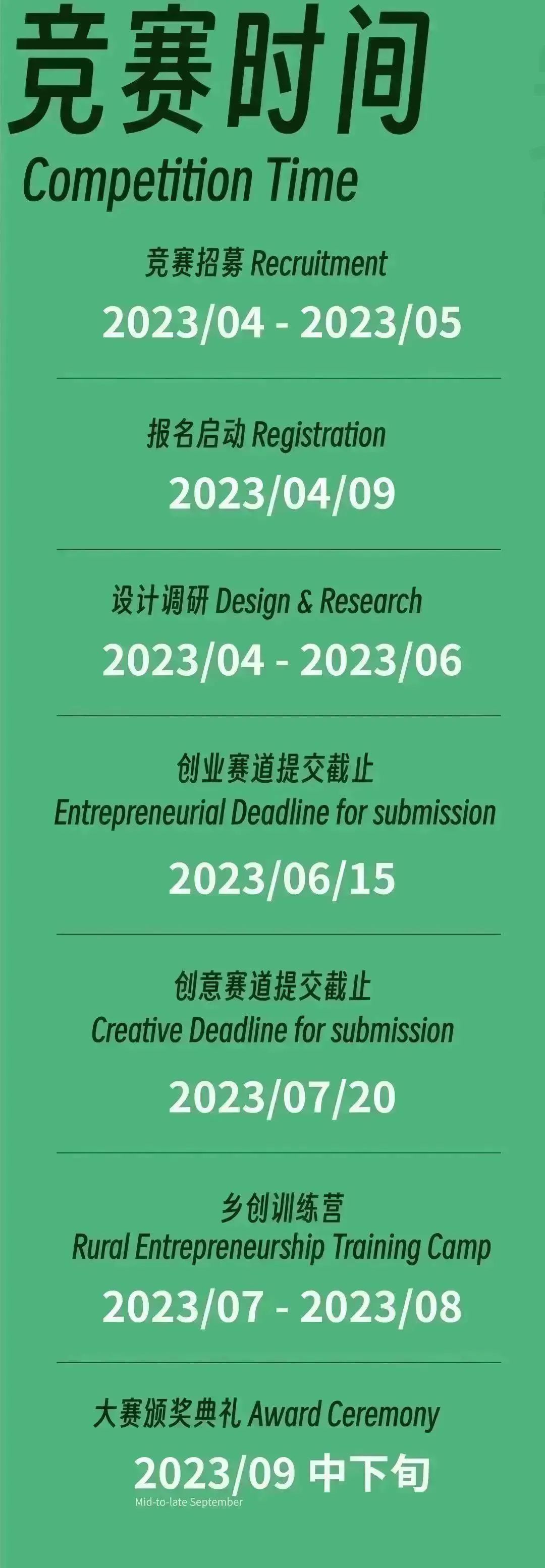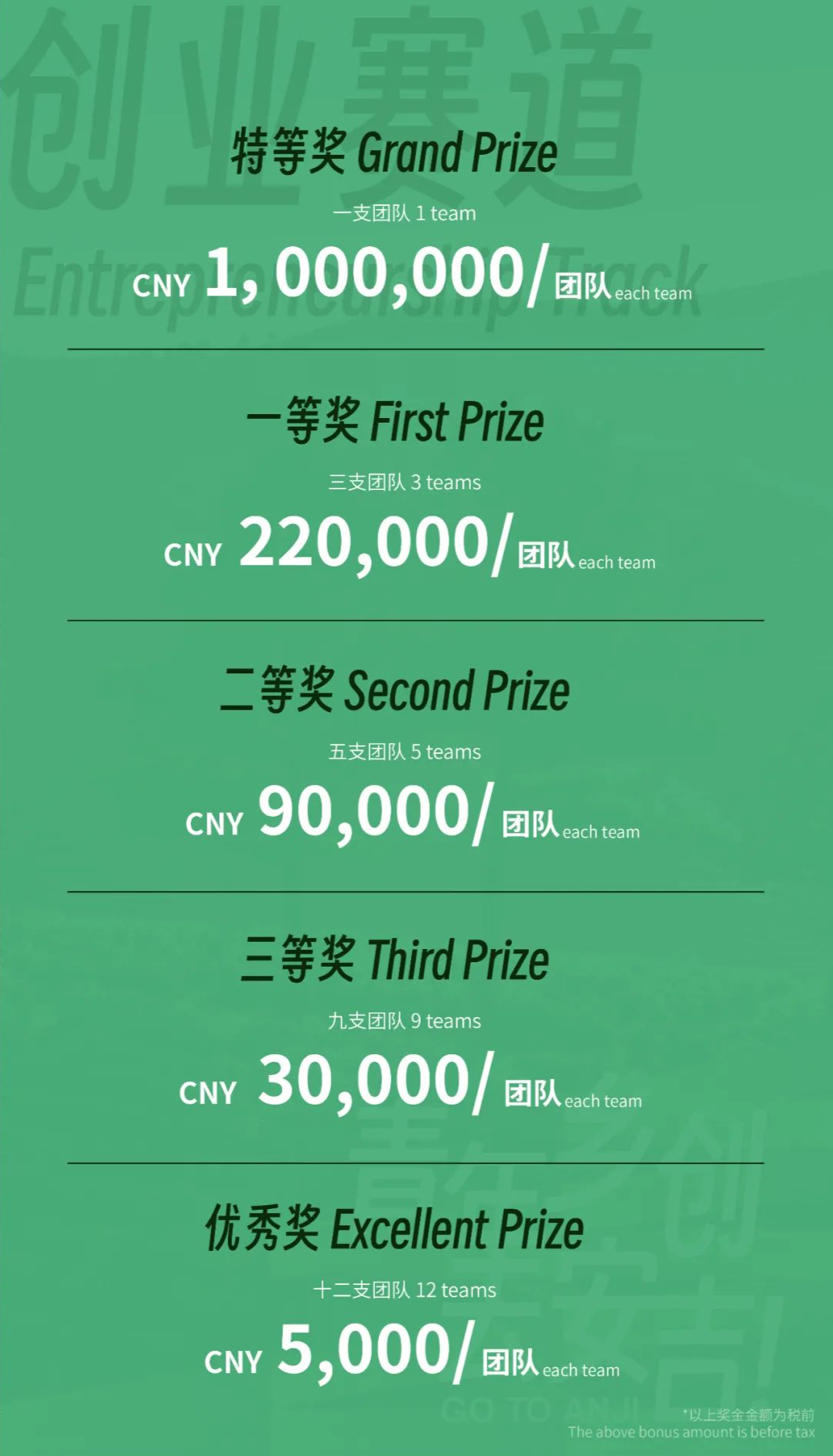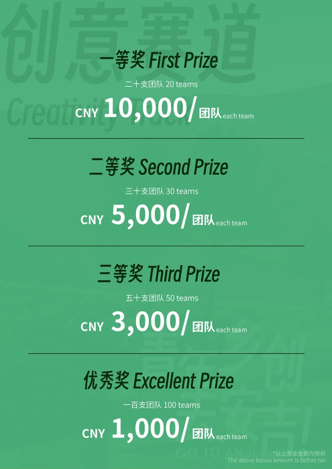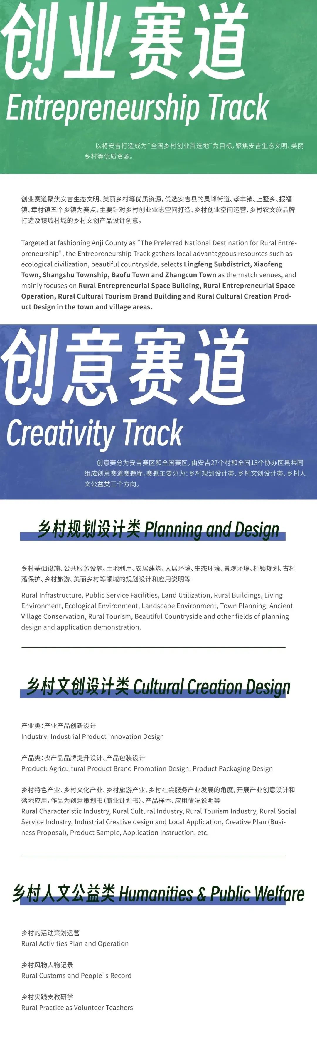 |  阳光掠过白茶园, When the sun beams down the white tea garden, 青山里的鸣蝉打了个盹儿, cicadas in the green hill are taking a nap; 晚风抚过竹海绿叶, When the night breeze fans the bamboo groves, 溪边的农家小院里亮起了点点灯火。 the farmyards by the stream are lighted. 111 GO TO ANJI ! 安吉 安且吉兮 。 01 /////// A Safe And Auspicious Place even with a shoe full of slush. 这里有全国首个县级竹林碳汇收储交易平台, The first country-level platform for bamboo forest carbon sequestration, storage and trading in China, 这里有联合国认证的“世界最佳旅游乡村”, one of the “Best Tourism Villages” verified by the UN, 这里是两山理念的发源地、乡村振兴的样板间, the birthplace of “Two Mountains Theory”, and the model of rural revitalization, 这里是安吉 here is Anji County: ——乡创青年的梦想摇篮。 The dream cradle in the countryside for the youth to start their business. 为助力青年人才回乡创业,打响"乡村创业首选地”的品牌,由新华通讯社主办、湖州市安吉县和新华社品牌工作办公室联合承办,浙江财经大学为秘书处单位的首届“两山杯”全国大学生乡村振兴创新创意创业大赛,在“青山绿水”的安吉应运而生。 In order to facilitate the youth to start their business in the countryside, and promote the brand of “The Preferred Destination for Rural Entrepreneurship”, the National College Students Rural Revitalization Innovation and Entrepreneurship Competition, as hosted by Xinhua News Agency and jointly undertaken by Anji County of Huzhou City and Xinhua News Agency Brand Office with Zhejiang University of Finance & Economics as the Secretariat Institute, comes into being in Anji County, a place highlighting “lucid waters and lush mountains”. 来安吉吧!让我们趁着春风,一起去青山下、绿水旁、田野间、竹林中、村舍里,一起共筑“Deep Green”,寻找未来乡村的答案。 Welcome to Anji County! Let us go with the spring breeze to explore green hills, clear streams, interesting fields, bamboo groves and cottages, so as to establish “Deep Green” together and depict the future countryside. 02 GO TO ANJI ! 青年乡创 去安吉 ! /////// Welcome to Anji County to Start Your Business! even with a shoe full of slush. 安吉需要青年, Anji County is hungry for the youth, 同样, 青年更需要安吉。 who likewise cannot miss Anji County. 乡村振兴,产业是根本,人才是关键。当生态与人文的积淀与时代机遇相逢,安吉这片希望的田野将为青年提供展现梦想与创意的舞台。 For rural revitalization, industries are the foundation while professionals function as the key. When the age-old ecology and culture meet with the age of opportunity, Anji County, this field full of hope, will serve as a wonderful platform for the youth to display their creativity and realize their dreams. 以赛号召全球青年,来安吉,去乡村。通过创业赛道、创意赛道对乡村的闲置空间、产业业态、文旅品牌、乡村文创产品等进行创新创意创业设计。用数字赋能乡村,用艺术点亮乡村,促进乡村文化在地生长,让乡村活起来。 This competition aims to take the opportunity to gather global youth here and explore the countryside. Two tracks for entrepreneurship and creativity are respectively set for participants to carry out innovative, enterpreurial and creative design on the basis of rural idle space, industrial format, cultural and tourism brands, rural cultural and creative products and so on, so as to empower the countryside with digitization, light up the countryside with art, promote the growth of rural culture and vitalize the countryside. GO TO ANJI ! 竞赛 奖金 , 03 /////// Awards & Prizes even with a shoe full of slush. 创业赛道  创意赛道  04 GO TO ANJI ! 活动 亮点 。 /////// Highlights even with a shoe full of slush. · 百万创业奖金 One-Million Entrepreneurship Award 一百万创业扶持奖金,引进人才政策等Buff加持,助力乡村创业! One-million-yuan entrepreneurship award, diversified talent introduction policies and many other benefits are accessible to support rural entrepreneurship! · 百道乡村赛题 One-Hundred Topics 百道乡村赛题,分布全国类型多元,涉及创业、空间设计、乡村规划、文创设计、品牌运营等方向。入围后,更有丰厚的调研补贴等你来拿! A hundred topics are provided, covering diversified directions nationwide such us entrepreneurship, space design, rural planning, cultural and creative design and brand operation. Generous research subsidies are ready for the finalists. · 百种共创活动 Diversified Community Activities 驻村调研设计期间,Workshop训练营、展览、乡村市集等多样的共创活动为你链接世界。 During the research and design period in the village, a variety of community activities such as workshop camp, exhibition and country fair will be held to get you connected with the world. · 百万全球传播 Millions of Views Around the Globe 多家媒体矩阵,百万传播流量,大声告诉世界:“安吉,我们来了”。 Multiple media matrices and millions of views will jointly tell the world loudly: “Here we come, Anji !” · 赛事专家 List of Experts  GO TO ANJI ! 竞赛 解读 , 05 /////// About the Competition even with a shoe full of slush. 本次竞赛分为创意赛道、创业赛道两大赛道,我们遴选了百道乡村赛题,你可以跟着赛题去河南、云南、海南………的乡村。 This competition has set two tracks, the Creativity Track and the Entrepreneurship Track respectively. A hundred of topics are carefully screened, following which you can visit the countryside in Henan Province, Yunnan Province, and Hainan Province, etc.  创意赛道分为安吉赛区和全国赛区。安吉赛区由安吉全域15