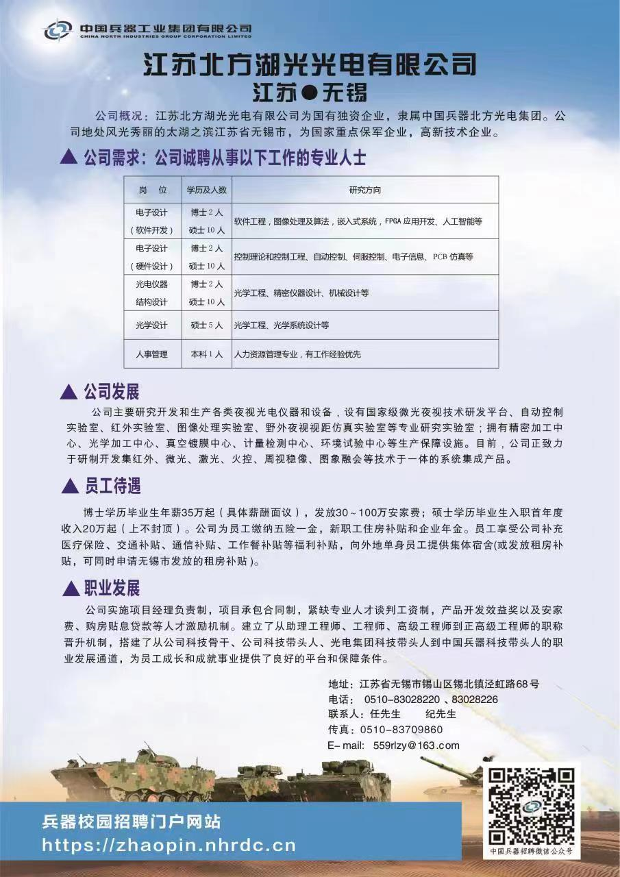 工作人员对申请材料进行筛选和资格审查。约2周内将电话通知通过资格审查的应聘人员,联系安排实习考察事宜。未通过审查的将不另行通知。 有意向的应聘者需到我单位进行为期1-3个月实习考察(博士或特别优秀的实习人员可以缩短为1个月),我单位将提供实习补贴(3700元/月)。 通过实习考核后,适时组织招聘考试。 根据考试成绩确定拟录用人选,通过政审、体检后与浙江省经济信息中心全资下属企业签订劳动合同。 ◆ 硕士应届生:一次性生活补贴3万元;租房补贴每年1万元,可发放3年。 ◆ 博士应届生:一次性生活补贴10万元;高层次人才租赁(购房)补贴为每月2500元,最长5年;购买首套房可优先参与摇号。 ◆ 联系人:肖老师(0571-81050290) 江老师(0571-87054152) 来电时请说明咨询招聘事宜。 ◆ 邮箱:zjsjjxxzx2022@126.com ◆ 地址:杭州市西湖区环城西路33号省行政中心四号楼。 3、【江苏】北方湖光光电 【公司简介】