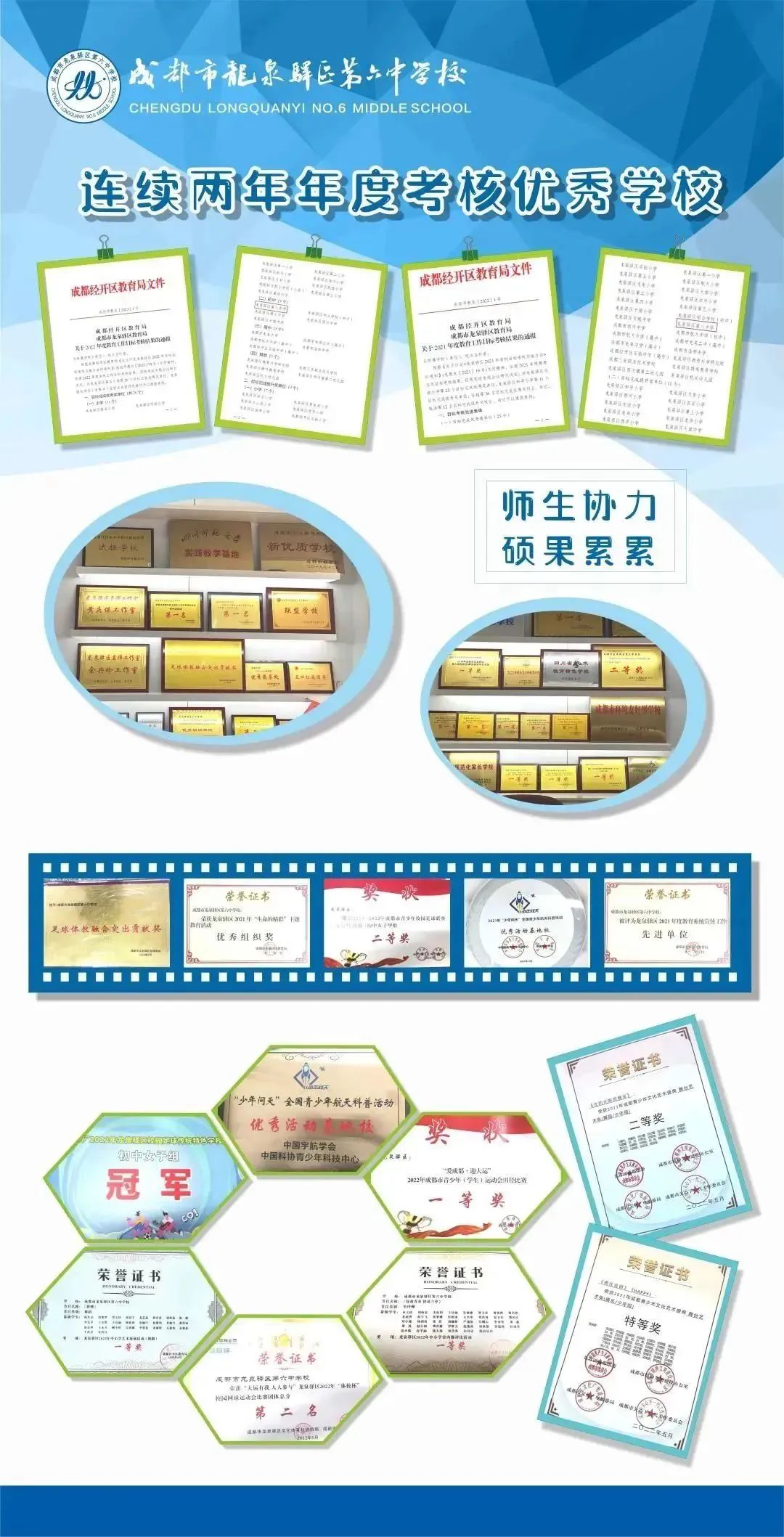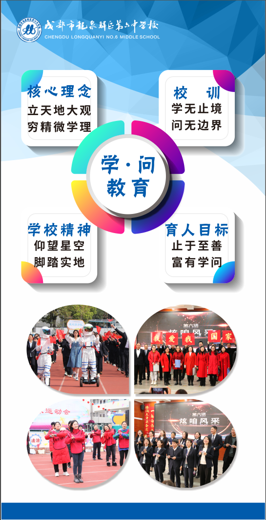 四川省首批重点中学 四川省艺术教育特色学校 成都市新优质学校 成都市阳光体育示范校 成都市校风示范校 这里是—— 成都市龙泉驿区第六中学校 如果,你和我们一样 脸上有笑、心中有爱、眼中有光 如果,你渴望 名师引领、团队助力、平台促长 我们在这里 等你来! 成都市龙泉驿区第六中学校地处成都经济技术开发区航天城内,占地50余亩,建筑面积1.65万㎡,现有36个教学班,在校学生1600多名,教职员工140余名,其中中小学高级教师102人,区级以上骨干教师、学科带头人等名优教师47人。学校文化底蕴深厚,师资力量雄厚,硬件设施一流。教育教学综合质量一直处于区域领先水平,是近年来区域内为清华、北大等重点大学输送优秀毕业生最多的一所初级中学校。