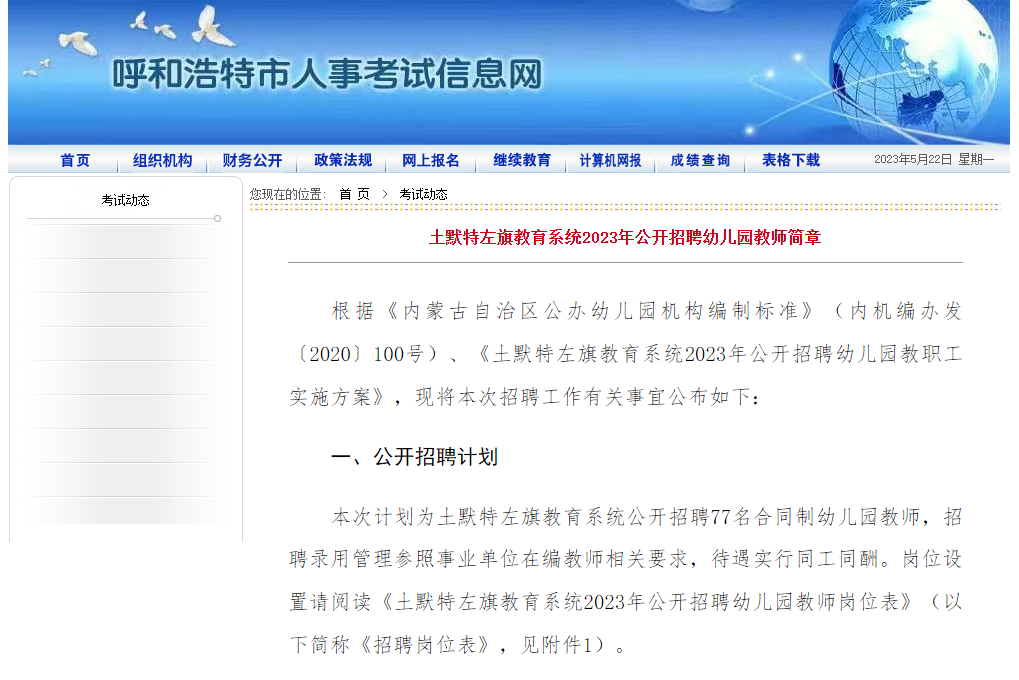 土默特左旗教育系统2023年 公开招聘合同制幼儿园教师77人简章已发布 明日9时开始报名 一起来了解下相关内容吧! 时间节点  报名时间:5月23日9时—5月25日17时 资格初审时间:5月23日9:00—5月26日12:00 缴费时间:5月25日10:00—5月26日24:00 打印准考证时间:拟定于6月1日9:00—6月2日17:00 笔试时间:拟定于6月3日,具体时间及地点详见准考证 / 招聘简章 / 土默特左旗教育系统2023年公开招聘幼儿园教师简章  点击文末“阅读原文”查看公告 向上滑动阅览 根据《内蒙古自治区公办幼儿园机构编制标准》(内机编办发〔2020〕100号)、《土默特左旗教育系统2023年公开招聘幼儿园教职工实施方案》,现将本次招聘工作有关事宜公布如下: 一、公开招聘计划 本次计划为土默特左旗教育系统公开招聘77名合同制幼儿园教师,招聘录用管理参照事业单位在编教师相关要求,待遇实行同工同酬。岗位设置请阅读《土默特左旗教育系统2023年公开招聘幼儿园教师岗位表》(以下简称《招聘岗位表》,见附件1)。 二、报考条件 (一)报考人员必须具备下列条件: 1.具有中华人民共和国国籍; 2.遵守《中华人民共和国宪法》和法律,政治坚定,热爱祖国,拥护中国共产党领导和社会主义制度,执行党的路线、方针、政策; 3.铸牢中华民族共同体意识,自觉维护民族团结进步; 4.热爱党的教育事业,有理想信念、有道德情操、有扎实学识、有仁爱之心,具有强烈的事业心和责任感。能够自觉遵守《中华人民共和国教师法》《教师职业道德规范》《中小学、幼儿园教师职业行为十项准则》,遵纪守法,品行端正,在校或工作(待业)期间表现良好,未受过任何刑事处罚; 5.具有良好的身体素质和心理素质,身体健康,无传染性疾病,无精神病史,能适应教育教学工作的需要; 6.具有从事教育教学工作必备的能力和素质,掌握并能够运用教育教学基本理论和技能,胜任招聘岗位教育教学工作的需要; 7.须取得相应的教师资格证书(2023年8月31日前取得); 8.须具有普通话水平测试二级乙等及以上等级证书(2023年8月31日前取得); 9.年龄一般为18周岁以上,35周岁以下,即1987年5月23日(不含)至2005年5月23日(含)期间出生; 10.现为土默特左旗定岗定薪合同制幼儿教师人员年龄放宽至40周岁以下,即1982年5月23日(不含)至2005年5月23日(含)期间出生; 11.报考人员选报岗位须与所学专业一致。 (二)下列人员不得报考: 1.在读的普通高等学校全日制专科生、本科生、研究生(不含当年12月底前毕业的应届毕业生); 2.试用期内和未满最低服务年限的机关、事业单位工作人员; 3.曾因犯罪受过刑事处罚的人员,被开除公职的人员,被开除中国共产党党籍的人员,被依法列为失信联合惩戒对象的人员; 4.在公务员招考或事业单位公开招聘中被认定有舞弊等严重违反录用(聘用)纪律行为并在禁考期限内的人员; 5.现役军人; 6.报考后即构成回避关系岗位的人员; 7.曾有违反师德师风行为的人员; 8.法律法规规定不得聘用为事业单位工作人员的其他情形人员。 (三)按照国家和自治区有关要求,本次招聘部分岗位定向招聘服务期满且考核合格的“服务基层项目人员”和“大学生退役士兵”(以下统称“项目人员”,最低服务满2年)。 “服务基层项目人员”是指自治区人力资源社会保障厅牵头组织的高校毕业生“三支一扶”计划人员、高校毕业生社区民生工作志愿服务计划人员、面向中小企业和非公有制企业选拔储备高校毕业生计划人员;自治区教育厅牵头组织的农村牧区义务教育阶段学校教师特设岗位计划人员;自治区团委牵头组织的大学生志愿服务西部计划人员。 “大学生退役士兵”是指国家统一招生(含自主招生和保送)的普通高等院校大学专科以上学历的退役士兵。退役士兵是指服现役满2年。 对于定向招聘“项目人员”的岗位,要求报名人员须为2023年5月23日(含)前服务期满且考核合格的服务基层项目人员或在报名开始日前已退役的大学生士兵。 凡是到报名开始日,“项目人员”服务期满或退役(先退役后取得毕业证的,从毕业时间算起)超过3年或被录用为公务员(含参照公务员法管理单位工作人员,下同)、被聘用为事业单位工作人员(列编招聘)的,不能再报名“项目人员”岗位,只能报名其他岗位。 (四)2023年应届毕业生学历学位取得时间截止到2023年12月31日。 其他条件的取得时间,如本简章和《招聘岗位表》无特殊说明,截止日期为2023年5月23日(含)之前。 三、报名与资格初审 (一)报名 1. 报名统一采取网上报名的方式进行。报名网站:呼和浩特市人事考试信息网(http://www.hhpta.org.cn)。 2. 报名时间:2023年5月23日9:00—5月25日17:00。为避免网络拥堵,请报名人员尽可能提早报名。 报名人员须在规定的时间用居民身份证或护照报名,每名报名人员只能报名一个岗位(详见《招聘岗位表》)。报名时,报名人员应当签署《报名人员考试诚信承诺书》,否则不接受报名。报名人员须按要求在网上填写《土默特左旗教育系统2023年公开招聘幼儿园教师报名登记表》(以下简称《报名登记表》)相关信息,并上传本人近期正面免冠2寸数码彩照(jpg格式)。 (1)报名人员须逐一对照报名岗位需具备的条件,填写需要说明的情况。如教师资格证书、普通话水平等级测试证书或岗位所要求从业资格证书的证书等级、获取时间以及其他需要说明的情况。 (2)报名人员在填写“学习经历
