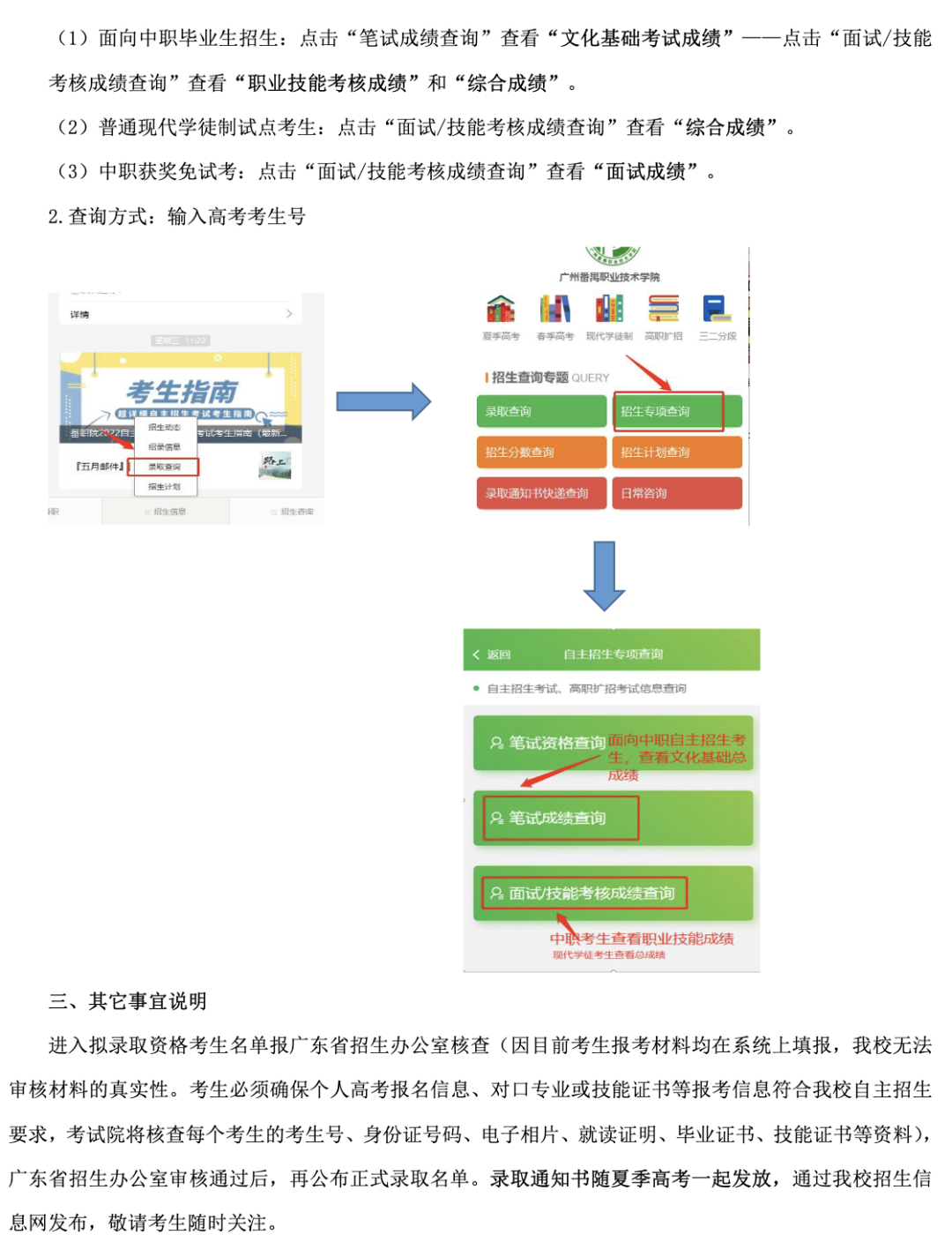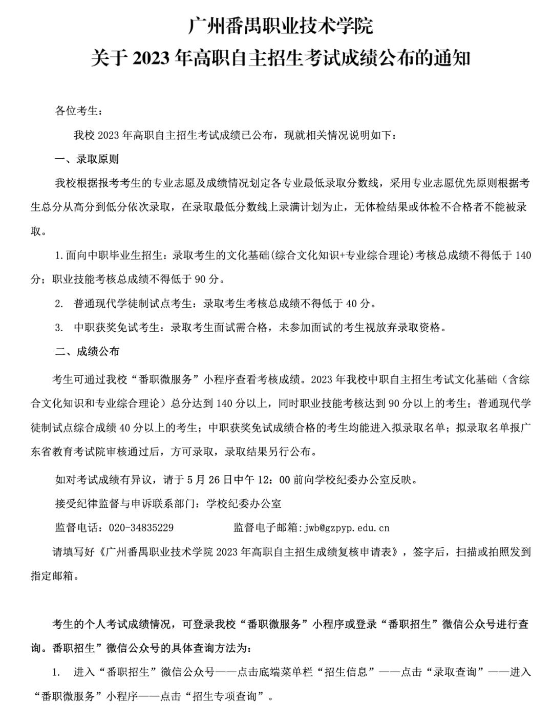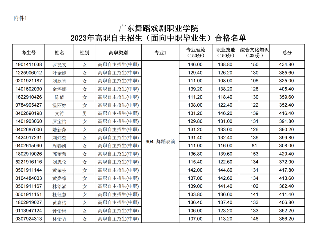 ![]() 广东省外语艺术职业学院 ![]() ![]() 广东工贸职业技术学院 各位考生: 根据《教育部办公厅关于进一步完善高职院校分类考试工作的通知》(教学厅函〔2021〕36号)、《关于做好2023年高等职业院校自主招生工作的通知》(粤教考〔2023〕13号)等文件精神,我校自主招生考核、阅卷、登分等工作严格按照《广东工贸职业技术学院2023年自主招生招生简章》等实施方案执行,现将自主招生考生考核成绩予以公示(见附件1)。 考生若对成绩有异议,可申请成绩复核,复查内容只涉及复核成绩统计合成是否有误,成绩有无漏评,计分、登分是否准确,是否有违纪记录或其它异常情况等,对评分标准、评分细则以及答题评分宽严这些不在复查范围,不接受考生本人查阅试卷。如需成绩复核的考生,请于5月25日前填写成绩复核申请表(见附件2),并亲笔签名后连同本人身份证、准考证扫描成图片后发送至电子邮箱zsb@gdgm.edu.cn,逾期或材料不全,不予受理。成绩复查结果将在我校招生信息网上公布,届时请关注。对本次考核情况如有异议者可在2023年5月26日12:00前拨打监督电话进行实名反映,逾期不再受理,视为无异议。 附件1:广东工贸职业技术学院2023年自主招生成绩公示名单 扫描下方二维码即可查询: ![]() 附件2:广东工贸职业技术学院自主招生考试成绩复查申请表 扫描下方二维码即可下载: ![]() 监督电话:(020)87702519 招生办联系电话:(020) 87745757 ![]() 广东舞蹈戏剧职业学院 各位考生: 根据省教育厅、省教育考试院相关文件要求,我校2023年高职自主招生考试工作已全部结束。 现对合格考生名单予以公示,公示期为2023年5月23日-5月26日。 若考生对考试成绩有疑问,可在2023年5月26日中午12:00前向我校招生办提出书面申请复核成绩,查分需附上本人身份证正反面复印件及成绩复核申请表,材料不齐不予受理。 邮寄地址:广东省广州市天河区水荫横路11号招生办 联系人:许老师,联系电话:020-87047560、87047495