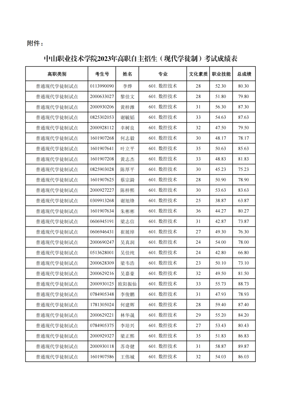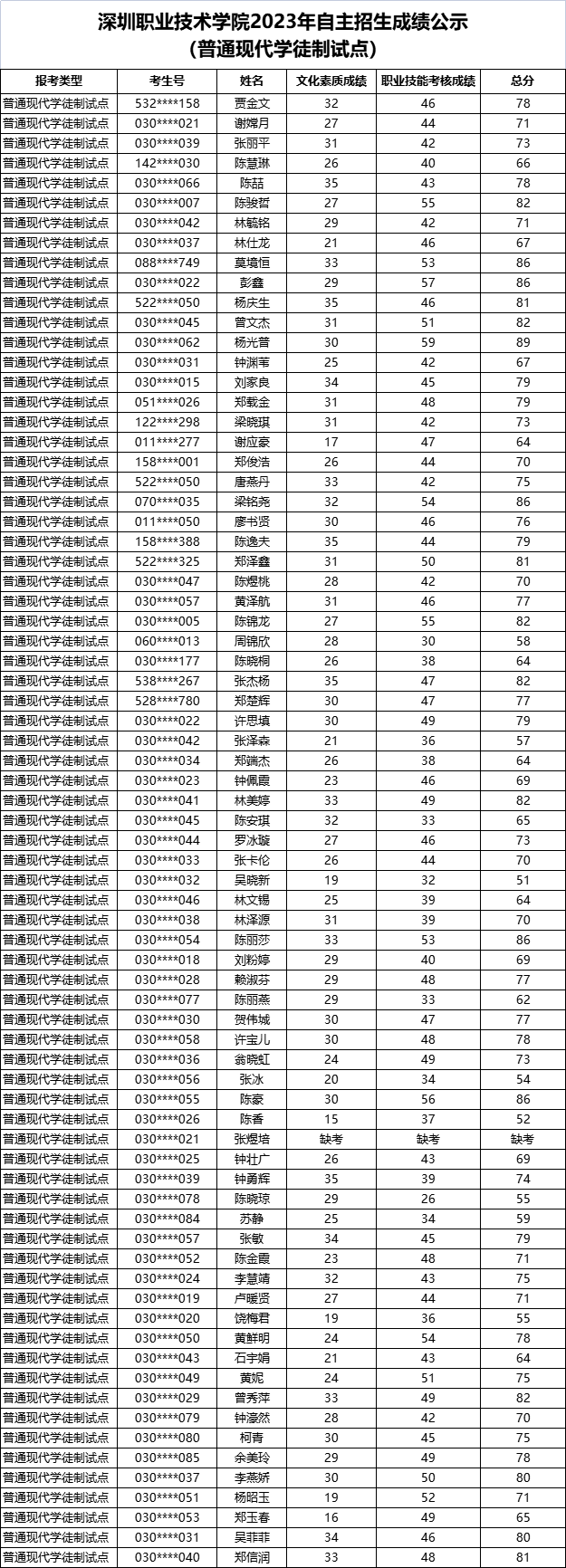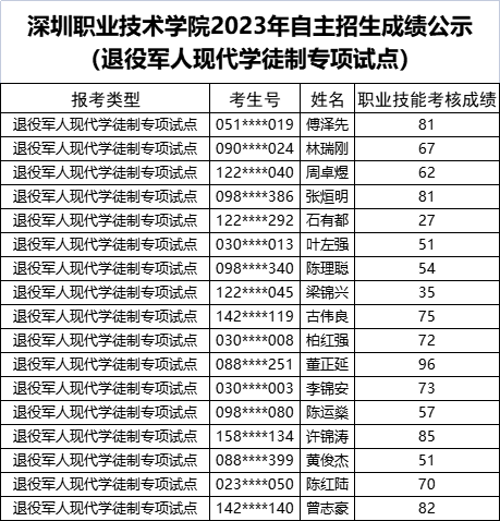 根据广东2023年高职自主招生日程安排,5月24日前,高职院校公示考核成绩。 ![]() 此前,广东体育职业技术学院、广东科学技术职业学院、广州民航职业技术学院、广东农工商职业技术学院、广州卫生职业技术学院、广州体育职业技术学院已公示2023年自主招生考试成绩。 今天,我们又汇总了深圳职业技术学院、深圳信息职业技术学院、河源职业技术学院、惠州工程职业学院、广东轻工职业技术学院、中山职业技术学院、湛江幼儿师范专科学校、广州松田职业学院、广东省外语艺术职业学院、广东工贸职业技术学院、广东舞蹈戏剧职业学院、广州工程技术职业学院等13校2023自主招生成绩,快来看看你的成绩吧! 其他学校的情况,我们将后续跟进并汇总~ ![]() 深圳职业技术学院 普通现代学徒制试点