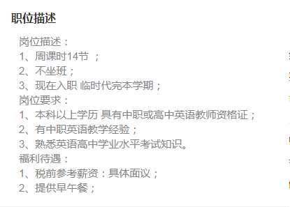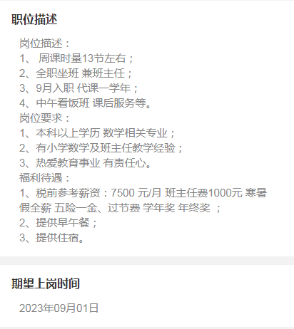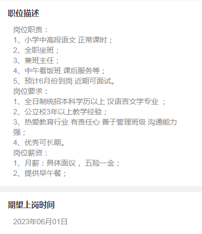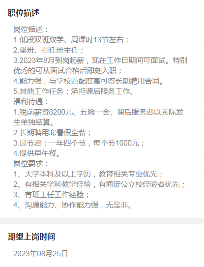 每日发布教师招聘信息 应聘须知: 1、学期中报名的岗位:量少、着急,聘用周期短。 2、本学期的岗:非常急,通常当日面试通过就上岗。 3、下学期储备岗:要求非常高、不急。 这一阶段,建议这些老师多关注: 1、有大班课教学经验,但没有公立校教学经验/或公立校教学经验少于3年。推荐报名学期中的急岗,成功可能性高。 2、经验丰富、学历条件好,骨干教师/特高级教师,希望换个学校工作的。推荐报名下学期储备岗。 01 小学中高段语文 1名 【海淀】一、岗位介绍