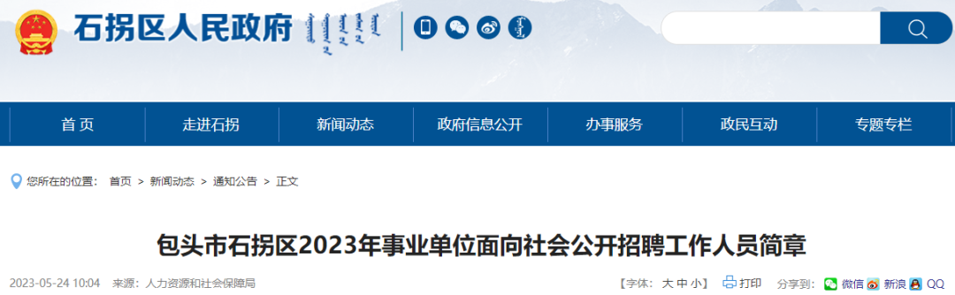 (五)公开招聘期间有关成绩公布、信息发布等事宜,将在石拐区人民政府官网及“石拐区人社局”微信公众号公布,请报考人员及时登录网站查询。