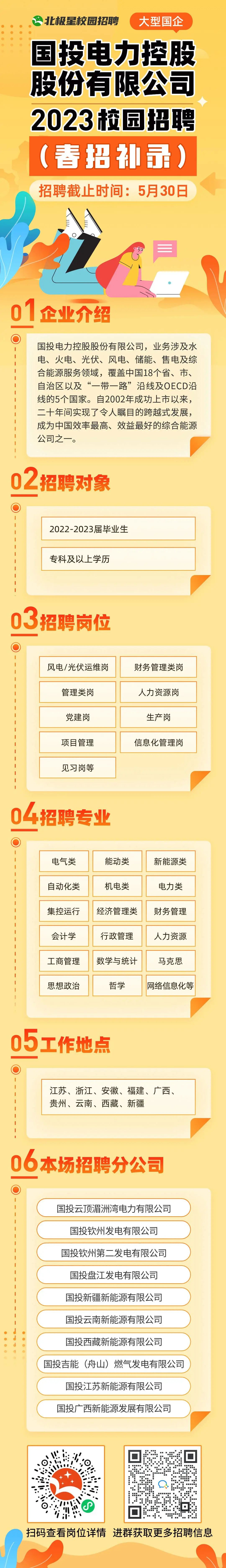 国投电力控股股份有限公司,是国家开发投资集团有限公司旗下的沪市A股上市公司(股票简称“国投电力”,股票代码“600886”)。自2002年成功上市以来,二十年间实现了令人瞩目的跨越式发展,成为中国效率最高、效益最好的综合能源公司之一。  作为国投集团的电力业务主体,公司积极践行绿色发展理念,把握经济发展机遇,坚持稳中求进,力促转型升级,为公司发展补短板,努力做强做优做大国有资本,加快推进公司高质量发展。公司业务涉及水电、火电、光伏、风电、储能、售电及综合能源服务领域,经营范围主要包括投资建设、经营管理以电力生产为主的能源项目,业务覆盖中国18个省、市、自治区以及“一带一路”沿线及OECD沿线的5个国家。国投电力装机结构以清洁能源为主,水火并济、风光互补,电源结构优良。 | 招聘分公司 | 招聘岗位 | 工作地点 | 学历要求 | 薪资待遇 | 专业要求 |  | 国投云顶湄洲湾电力有限公司 | 光伏项目值班员 | 福建莆田 | 本科 | 8千-1万 | 新能源科学与工程、电气工程及其自动化、机电一体化等新能源发电相关专业 |  | 国投钦州发电有限公司 | 生产岗位 | 广西钦州 | 本科 | 8-9千 | 热动、电气、集控运行等相关电力专业 |  | 财务岗位 | 广西钦州 | 本科 | 8-9千 | 财务相关专业 |  | 人资岗位 | 广西钦州 | 本科 | 8-9千 | 人力资源专业 |  | 国投钦州第二发电有限公司 | 生产准备部人员 | 广西钦州 | 大专 | 5-8千 | 热动、电气、集控运行等相关电力专业 |  | 国投广西新能源发展有限公司 | 计划管理见习岗 | 广西南宁 | 本科 | 5-7千 | 经济管理类、数学与统计类、法律专业 |  | 会计见习岗 | 广西省南宁市、广西钦州市、广西桂林市全州县 | 本科 | 5-7千 | 会计学、财务管理、审计、税务、金融及相关经济管理类专业 |  | 国投盘江发电有限公司 | 党建专责(见习) | 贵州六盘水 | 本科 | 1.8-2万 | 马克思主义、思政教育、中文、管理类等相关专业 |  | 国投新疆新能源有限公司 | 员工管理 | 新疆乌鲁木齐 | 本科 | 7千-1万 | 人力资源管理、工商管理等相关管理专业 |  | 党建管理 | 新疆乌鲁木齐 | 本科 | 7千-1万 | 思想政治教育、马克思主义理论、哲学等相关管理专业 |  | 风电/光伏运维工程师 | 新疆昌吉回族自治州 | 大专 | 7千-1万 | 电气工程及其自动化、电力系统及其自动化、自动化、风能与动力工程、能源与动力工程等相关专业 |  | 国投云南新能源有限公司 | 见习值班员 | 云南临沧市云县、茂兰,玉溪市元江县、华宁县,昆明东川等 | 本科 | 5-7千 | 电气专业或新能源发电专业或相关专业 |  | 国投西藏新能源有限公司 | 人力资源管理岗 | 西藏拉萨 | 本科 | 5-8千 | 人力资源管理、经济、行政管理、财务专业等相关专业 |  | 信息化管理岗 | 西藏拉萨 | 本科 | 5-8千 | 网络信息化相关专业 |  | 财务管理岗 | 西藏拉萨 | 本科 | 5-8千 | 财务、会计或相关专业 |  | 国投吉能(舟山)燃气发电有限公司 | 会计 | 浙江舟山 | 本科 | 6千-1.3万 | 会计学、经济学、税务、财务管理等相关专业 |  | 出纳 | 浙江舟山 | 本科 | 5千-1.1万 | 会计学、经济学、税务、财务管理等相关专业 |  | 国投江苏新能源有限公司 | 项目管理 | 安徽阜阳 | 本科 | 6千-1万 | 电气相关专业 |  | 会计 | 江苏南京 | 本科 | 6千-1万 | 财务或会计等专业 |