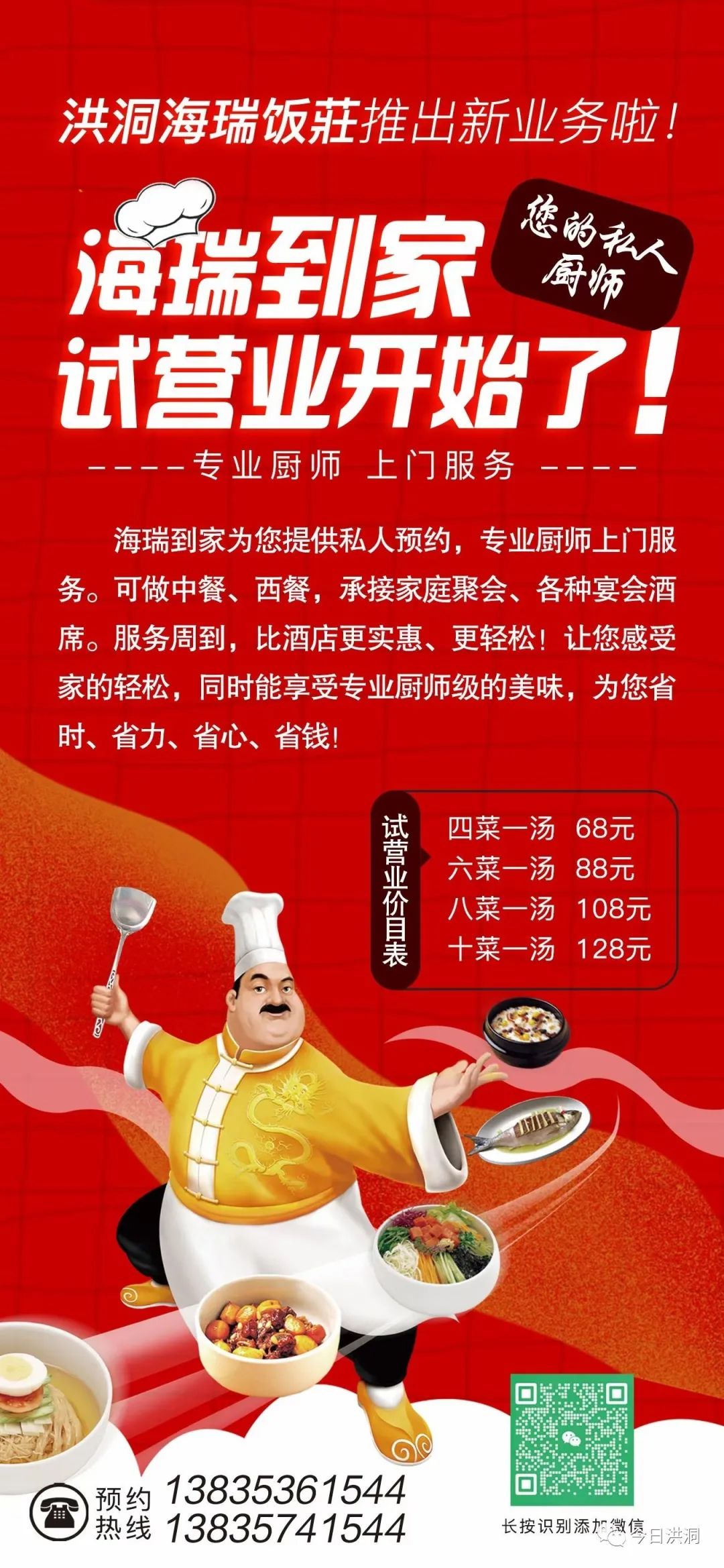 【招聘】 重八席大酒店因业务发展需要,现向社会诚聘以下人员: 人事主管,讲解员,房嫂,早餐员,餐厅服务员,餐厅传菜员,保洁,出品总监,厨师,厨房粗加工,打荷等若干名以上人员一经录用,待遇从优。报名电话: 18636745639 18734746157 报名地址: 重八席大酒店一层办公室